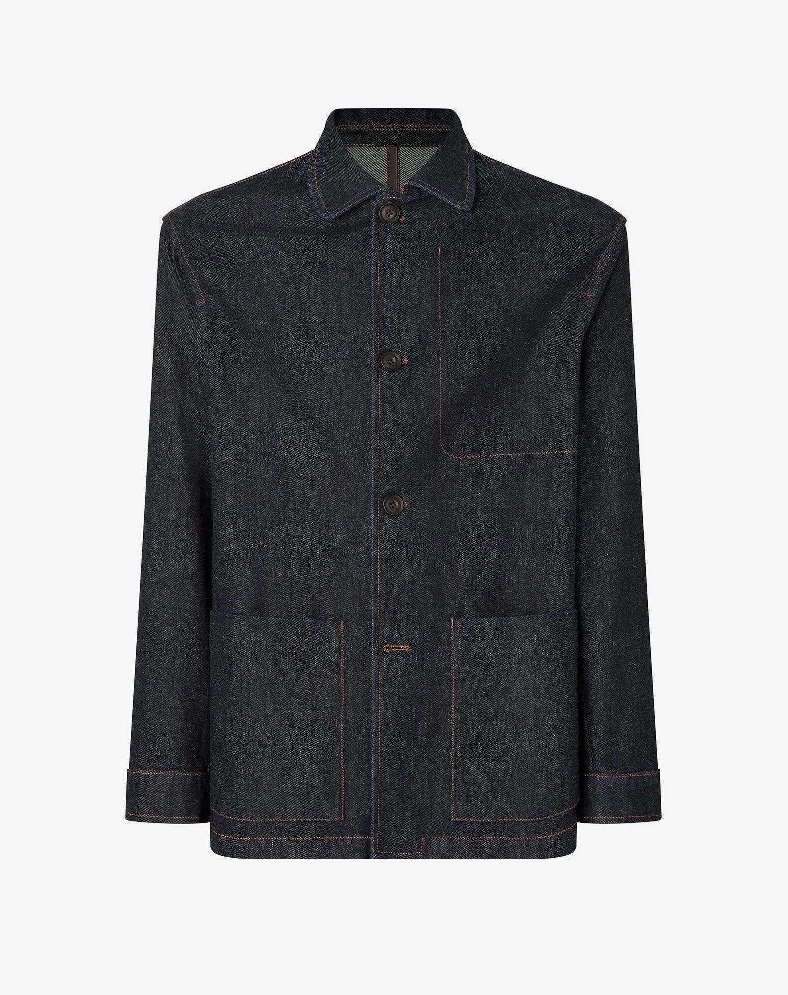 This blue, single-breasted, four-button jacket made from stretch denim charms with its unlined design and shirt-like collar and cuffs, for a touch of casual elegance. Its regular fit and 74 cm create the perfect balance between comfort and style, enhancing its authenticity and timeless soul. This jacket is part of the DENIM HISTORY capsule collection celebrating the Italian origin of the moleskin fabric known as “Geanes”, the ancestor of modern-day denim, traditionally worn by the ‘camalli’ - the dockworkers of the port city of Genoa. This jacket has a traditional feel due to its ring spun fabric, where the yarn acquires durability, softness and a one-of-a-kind irregular weave. The red and white selvedge, a hallmark of traditional shuttle looms, reflects a deep commitment to quality and heritage, making this denim a true emblem of style and authenticity. DETAILS AND MATERIALS - 99% cotton, 1% elastane - single breasted 4-button denim jacket - unlined - drop 7 - regular fit - shirt collar - appliqued side pockets - shirt cuffs - length 74 cm FIT & WASHING - Dry clean with perchloroethylene, do not bleach, do not tumble dry, maximum iron temperature 110°