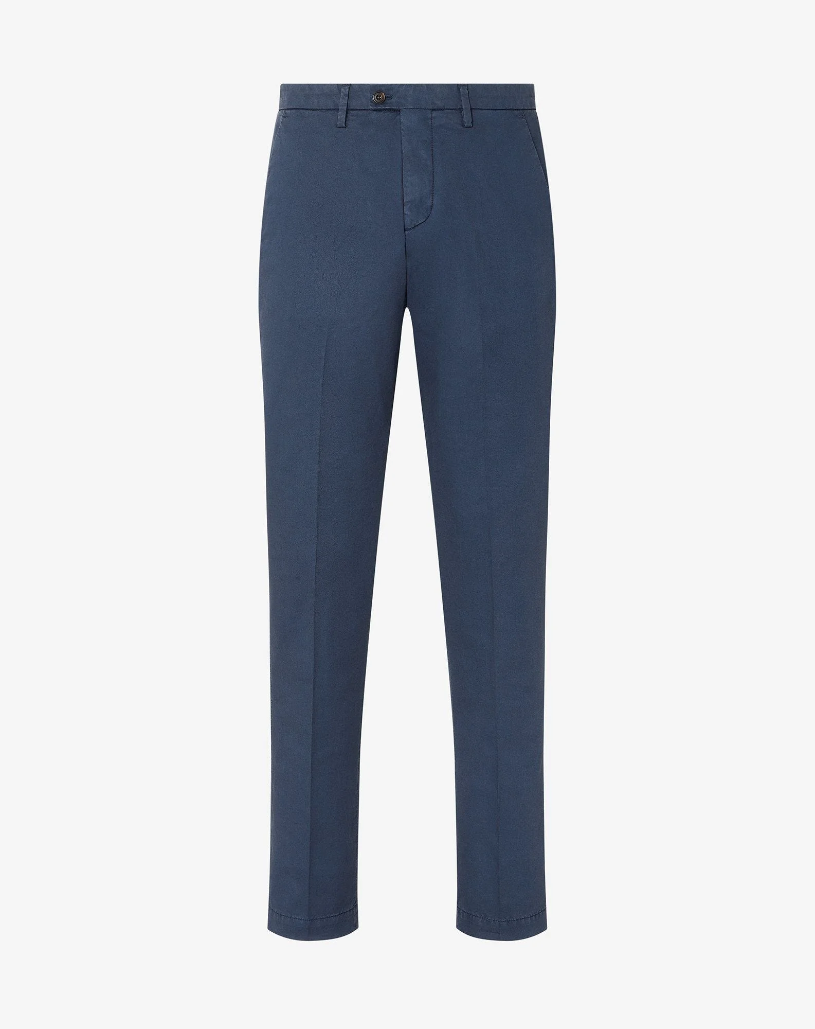 The blue garment-dyed men's stretch gabardine chinos have a slim fit and elegant design. The combination of cotton and lyocell, a semi-natural and fully biodegradable fibre, makes the fabric light and breathable. The garment-dyeing process gives the fabric a soft touch and intense, natural colour shades. DETAILS & MATERIALS - 77% lyocell, 20% cotton, 3% elastane - garment dyed stretch gabardine chinos - flat front - slim fit - slash pockets - rear welt pockets - doubled fabric inner waistband - bottom width 18 cm FIT & WASHING - This garment has a slim fit. The model is wearing a size 50 (IT). Model measurements: height 187cm, chest 98cm, waist 82cm, hips 98cm. Dry clean with perchloroethylene, do not bleach, maximum iron temperature 110°, do not tumble dry