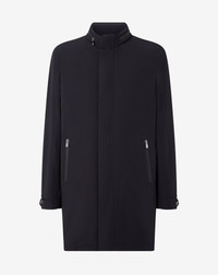A modern reinterpretation of a classic item of Men's outerwear, this blue caban coat is made from water-resistant stretch technical fabric to provide protection and comfort. Its design is enhanced by a detachable quilted wadding lining, perfect for heat regulation that follows the season. Features dual cursor metal zip closure in front, concealed snap buttons, hydrozip pockets and a concealed hood under the collar. Functional details like the adjustable frog fasteners at the sleeve end make this a practical yet sartorial garment. DETAILS AND MATERIALS - 90% polyamide, 10% elastane - caban coat with detachable quilted wadding lining - drop 7 - metal dual cursor zip closure and concealed snap buttons - hydrozip on pockets - hidden hood - frog fasteners at sleeve end with snap buttons - length 90 cm FIT & WASHING - Dry clean with perchloroethylene, do not bleach, do not tumble dry, maximum iron temperature 110°