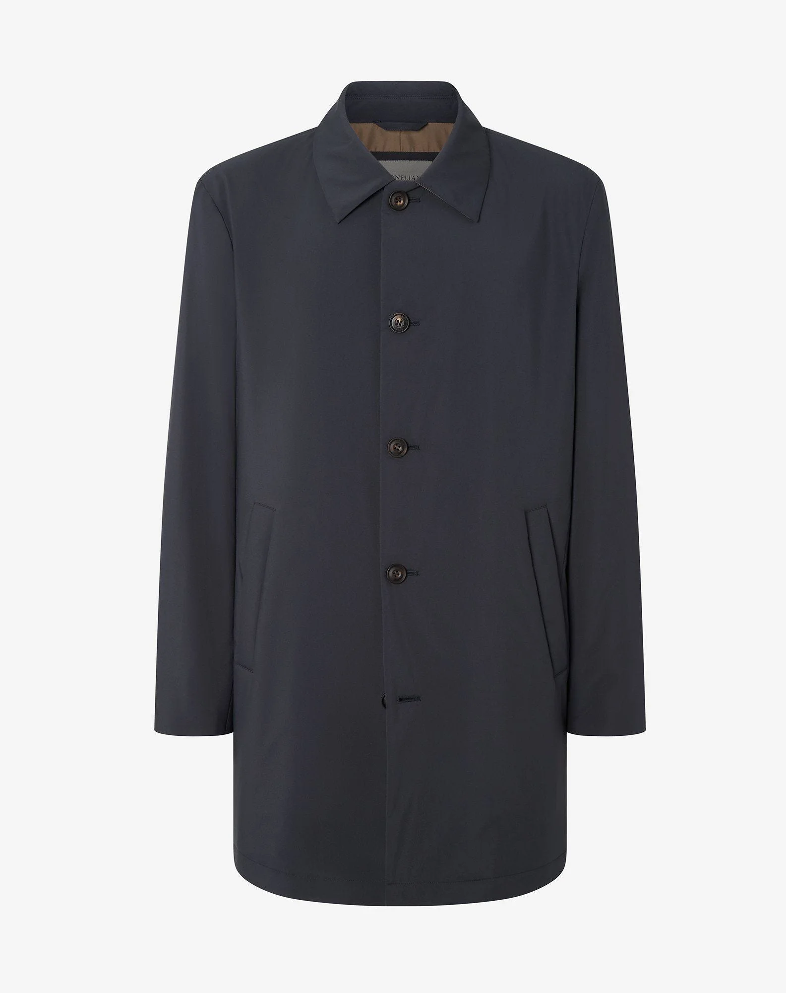 Dark melange grey chinos made from fine wool and stretch cashmere, designed to combine elegance with performance. Regular fit and superior comfort guaranteed by the stretch waistband on the rear and balanced drop 7. This garment is part of the Techwool Project, a selection of garments featuring this high-tech fabric blending the natural charm of merino wool with the softness and durability of polyamide fibres. This combination generates a compact and versatile texture that is also wrinkle-free and water-repellent, perfect for those who seek a sophisticated yet functional garment. Unlined, flat front trousers featuring waistband, slanted side pockets and welt back pockets, for dynamically smart style that fits both urban and outdoor days. DETAILS AND MATERIALS - 100% polyester - very light trench coat with wadding padding - drop 7 - two single welt pockets - 4-hole button fastening - slightly contrasting colour undercollar - slightly contrasting colour nylon lining - length 90 cm - Made in Italy FIT & WASHING - Dry clean with perchloroethylene, do not bleach, do not tumble dry, maximum iron temperature 110°