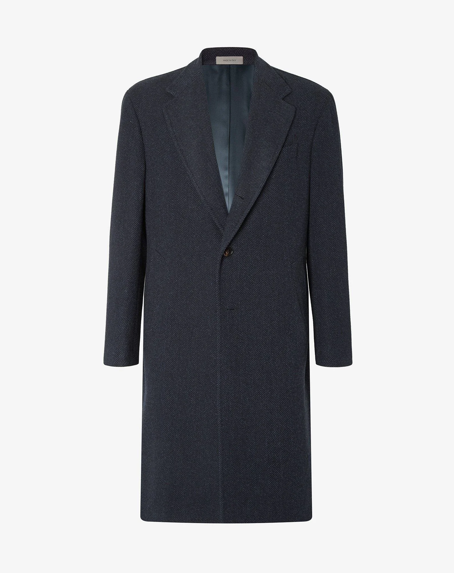 The classic aesthetic of the herringbone pattern finds new strength in this blue coat, crafted from a precious blend of virgin wool and cashmere. The three-roll-two button construction, combined with the martingale on the back, gives a refined and versatile allure. The notch lapels and AMF stitching masterfully finish the regular silhouette, emphasising the sartorial quality of the garment. This coat represents an icon of timeless men's elegance, entirely produced in Italy. DETAILS AND MATERIALS - 95% virgin wool, 5% cashmere - three-roll-two buttons wool and cashmere coat with herringbone pattern - drop 7 - AMF stitching - notch lapels - martingale - width 105 cm - Made in Italy FIT & WASHING - This garment has a regular fit. The model is wearing a size 50 (IT). Model’s measurements: height 187cm, chest 98cm, waist 82cm, hips 98cm. Dry clean with perchloroethylene, do not bleach, do not tumble dry, maximum iron temperature 110°