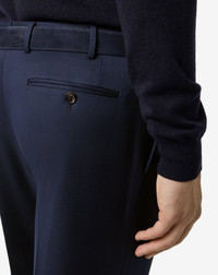Designed for everyday life with style and practicality, these blue trousers in virgin wool and stretch cotton offer the perfect balance of comfort and refinement. This garment is part of the Washable Project, designed to ensure easy maintenance without sacrificing sartorial quality, making it ideal for the contemporary man. The regular fit with a flat front enhances the clean, modern silhouette, while side slash pockets and double-welt back pockets with buttons add functional detail. A zipped waistband with belt loops ensures a secure and comfortable fit, complemented by a 19 cm leg opening that defines their balanced proportions. Versatile and dynamic, these trousers embody Corneliani’s philosophy of minimalist, contemporary elegance. DETAILS AND MATERIALS - 51% virgin wool, 47% cotton, 2% elastane - flat front Washable trousers - unlined - drop 7 - regular fit - slant side pockets - double-welt and button back pockets - belt loops - zip and waistband - bottom 19 cm - Washable bag included FIT & WASHING - Warm wash up to 30°, do not bleach, dry clean with perchloroethylene, do not tumble dry, maximum iron temperature 150°