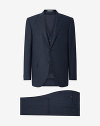 Timeless elegance defines this blue glen plaid wool flannel and cashmere suit, designed for the man who seeks a perfect balance between sartorial tradition and modern comfort. Featuring regular fit and structured shoulders, the garment stands out for its notch lapels and AMF stitching on the edge, details that underline its craftsmanship. The single-breasted two-button jacket is completed by a matching waistcoat, for all-round elegance. The lined trousers, with regular waist and slanted pockets, complete the set with a clean and refined design. A suit made in Italy that expertly interprets the tailoring glen plaid tradition in a contemporary perspective, ideal for gentlemen with a conscious style. DETAILS AND MATERIALS - 96% virgin wool, 4% cashmere - single-breasted two-button glen plaid wool flannel and cashmere suit with waistcoat - Leader range - lined - drop 7 - regular fit - well-defined shoulders - notch lapels - lapel width 9 cm - AMF stitching at the edge - welt breast pocket - patch side pockets - double side vent - neutral lining - natural horn buttons - width 75 cm - lined trousers - regular waist - slanted side pockets - welt back pockets with button - belt loops - flap with belt extension - bottom width 20 cm - Made in Italy FIT & WASHING - This garment has a regular fit. The model is wearing a size 50 (IT). Model’s measurements: height 187cm, chest 98cm, waist 82cm, hips 98cm. Dry clean with perchloroethylene, do not bleach, do not tumble dry, maximum iron temperature 110°