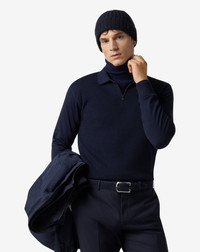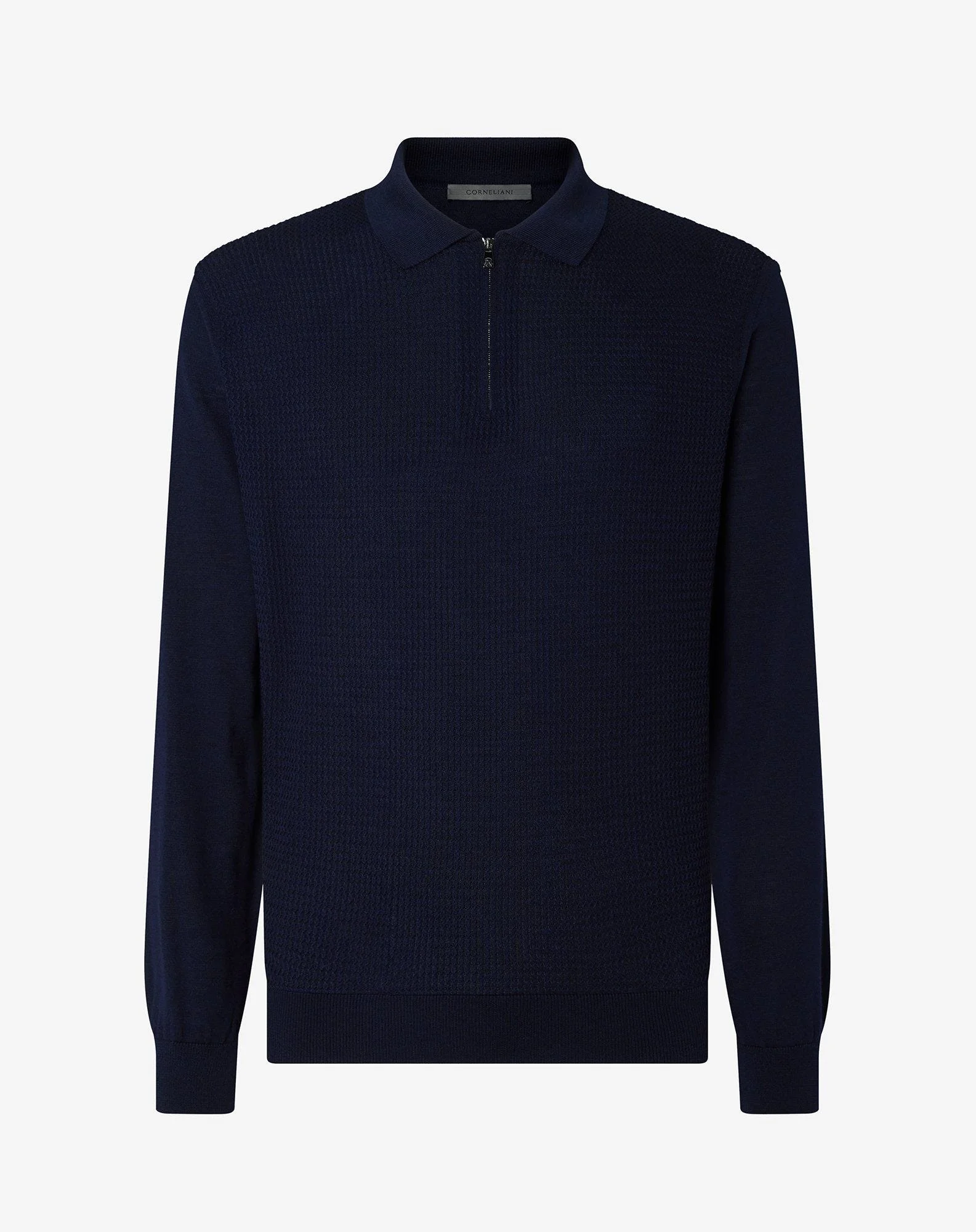 A garment characterised by elegance and tailoring know-how, this blue long-sleeved polo shirt is made from extra fine merino wool with a gauge to guarantee a light and soft feel. The exclusive embossed micro stitch adds sophisticated texture to enhance the quality of the OEKO-TEX-certified yarn, which is both sustainable and safe on the skin. Fully made in Italy, this polo shirt blends contemporary design and comfort for the man who seeks a versatile yet classy garment. DETAILS AND MATERIALS - 100% virgin wool - long-sleeved polo shirt with zip made from extra fine combed merino wool - relief micro stitch - 14 gauge - Made in Italy FIT & WASHING - Dry clean with perchloroethylene, do not bleach, do not tumble dry, maximum iron temperature 110°