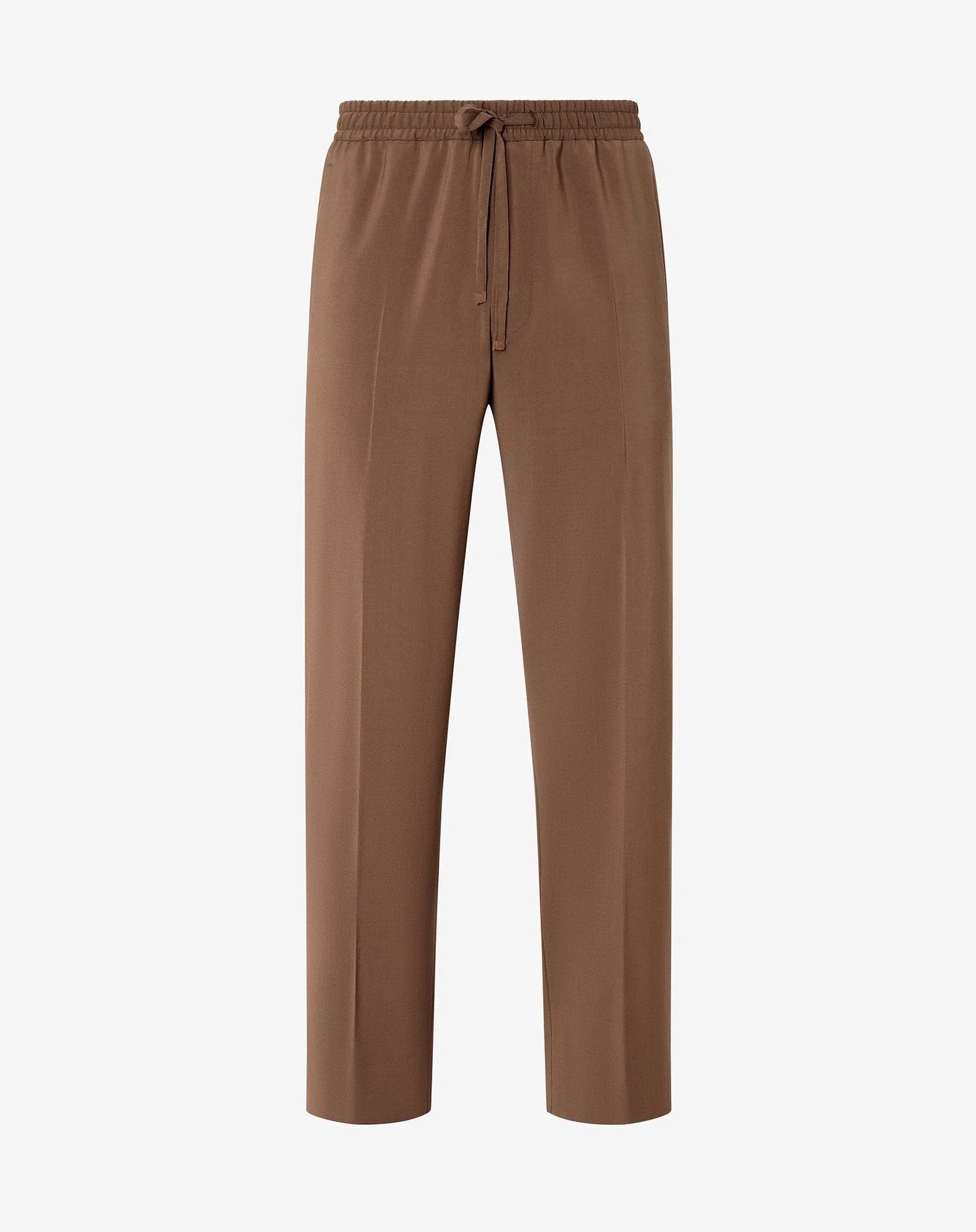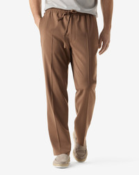 Made from tropical Super 120's natural stretch wool, these brown trousers from the ENDLESS SUMMER project combine a tailored fabric with a leisurewear-inspired design. The belt with suede drawstring at the waist, the slant pockets and the 20 cm bottom define a clean but relaxed style, suitable for casual looks and leisure time. ENDLESS SUMMER PROJECT: Compact, technical, lightweight and breathable natural stretch poplin. With its matte appearance, it suitably revamps classic garments, from dinner jackets to five-pocket trousers, while retaining poplin´s typically responsive and bold drape features. DETAILS AND MATERIALS - 100% virgin wool - natural stretch super 120's tropical wool trousers - suede drawstring at the waist - slant front pockets - welt back pocket with button - bottom width 20 cm FIT & WASHING - This garment has a regular fit. Dry clean with perchloroethylene, do not bleach, do not tumble dry, maximum iron temperature 110°