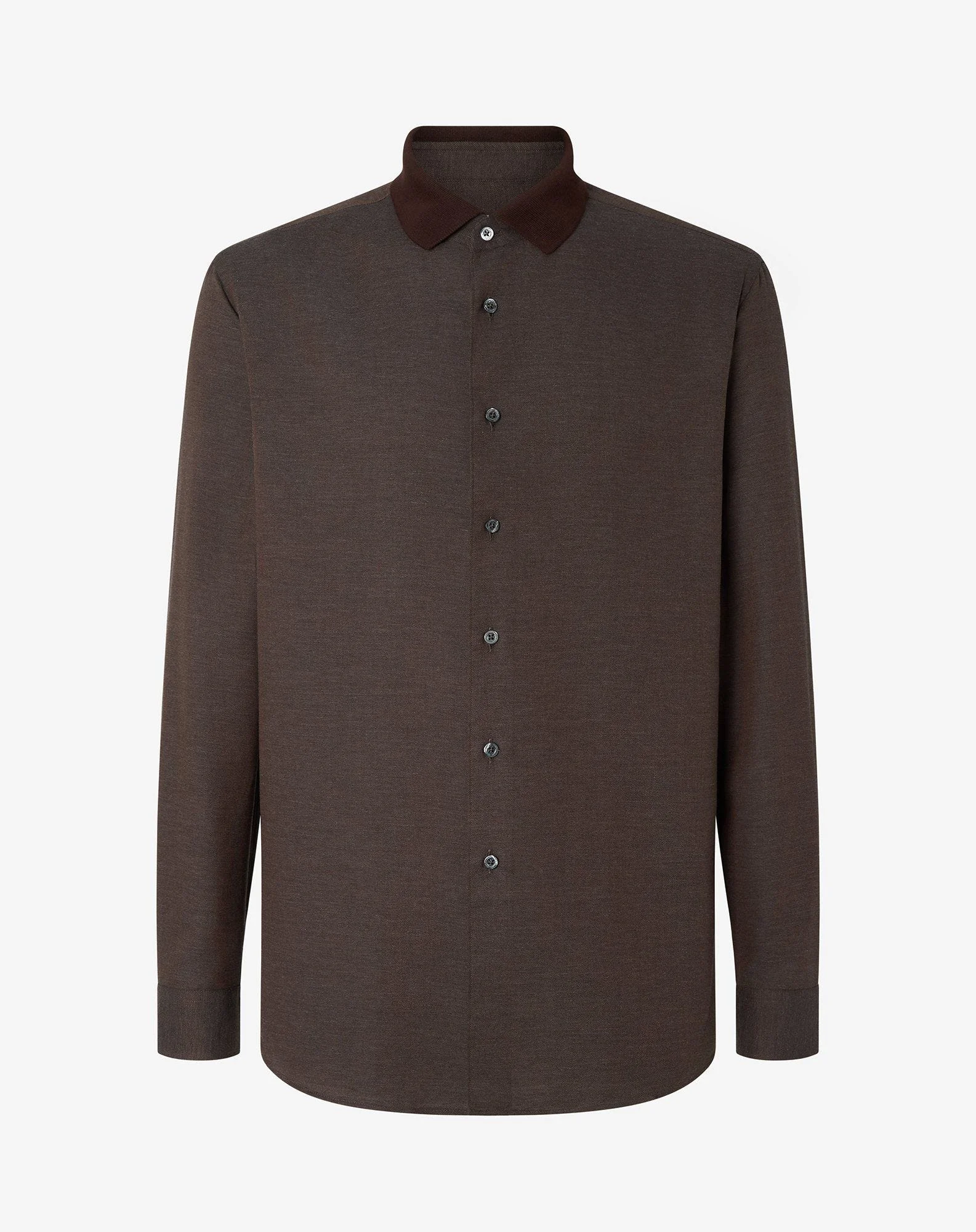 This brown shirt combines the softest cotton flannel with the finest cashmere to achieve a hug-like warm feel. The knit collar adds a contemporary easy touch that suits its comfort fit perfectly. Ideal for an easy smart look in the chilliest months. Made in Italy. DETAILS AND MATERIALS - 94% cotton, 6% cashmere - long-sleeved cotton flannel and cashmere shirt - relaxed fit - knitted collar FIT & WASHING - This garment has a relaxed fit. The model is wearing a size 41 (IT). Model’s measurements: height 187cm, chest 98cm, waist 82cm, hips 98cm. Maximum wash temperature 40°, do not bleach, dry clean with perchloroethylene, do not tumble dry, maximum iron temperature 110°