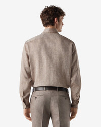 The bowling collar on a relaxed fit shirt is a detail that adds an informal touch to the outfit. This pure linen style in brown is perfect for hot summer days, on holiday and in the city. DETAILS & MATERIALS - 100% linen - long sleeve Chambray linen shirt - relaxed fit - bowling collar - straight hem with slits - rounded cuffs FIT & WASHING - This garment has a relaxed fit. The model is wearing a size 41 (IT). Model measurements: height 187cm, chest 98cm, waist 82cm, hips 98cm.