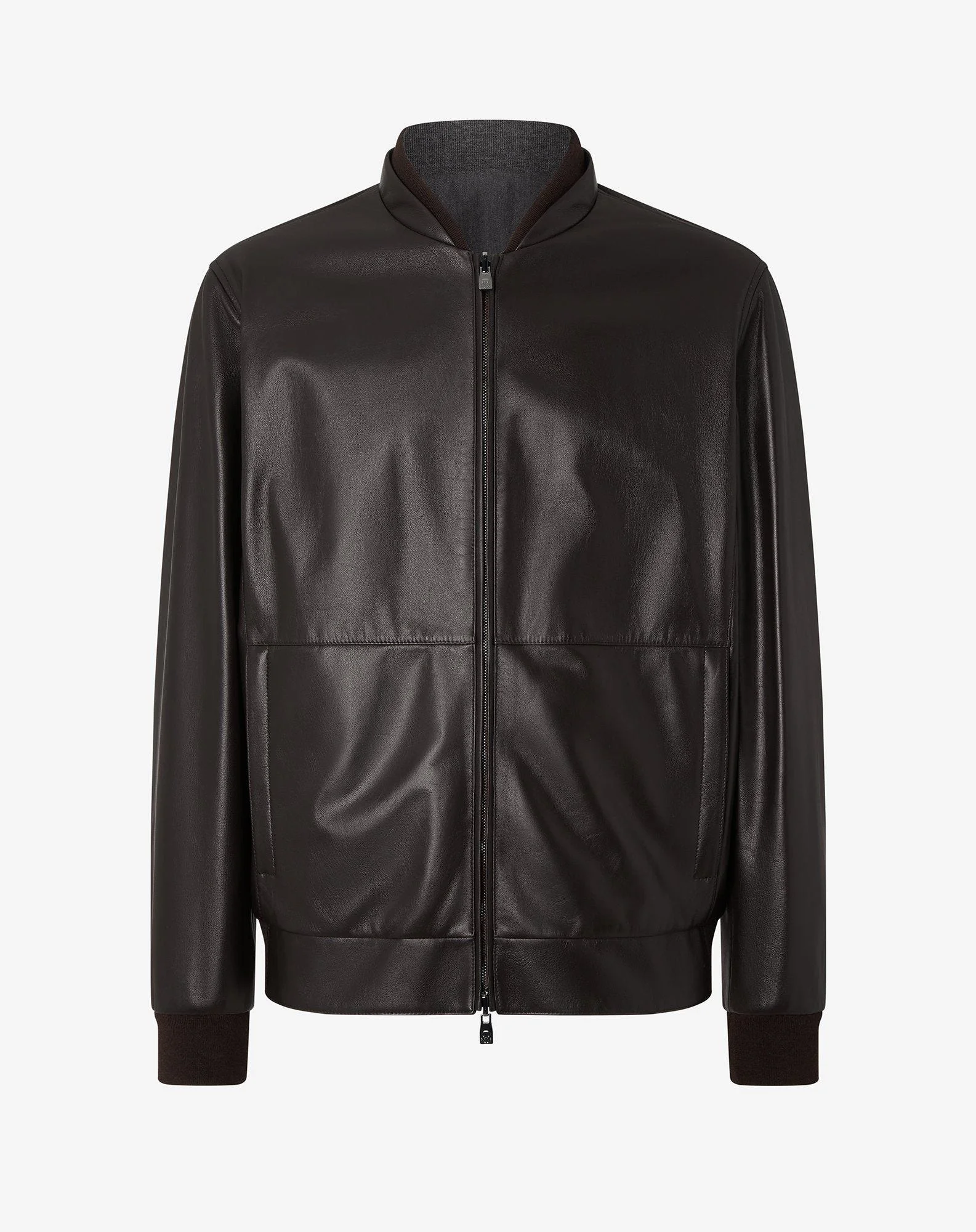 Blue stretch technical fabric bomber jacket, the perfect balance between style and performance. Crafted in a blend of technical fibres, it is wadding-padded for a lightweight warm feel. The dual cursor zip closure is enhanced by the collar with two concealed snap buttons, while the zipped double welt pockets blend design with functionality. The inside of the collar, hem and cuffs are trimmed with ribbed knit and eco-suede details that add personality DETAILS AND MATERIALS - 100% leather - reversible nappa leather jacket - drop 7 - metal dual cursor zip closure - two welt back pockets with zip - dual collar with inner knit lining - ribbed knit trim on cuffs and rear hem - inner flannel fabric - length 65 cm - Made in Italy FIT & WASHING - Dry clean with perchloroethylene, do not bleach, do not tumble dry, maximum iron temperature 110°