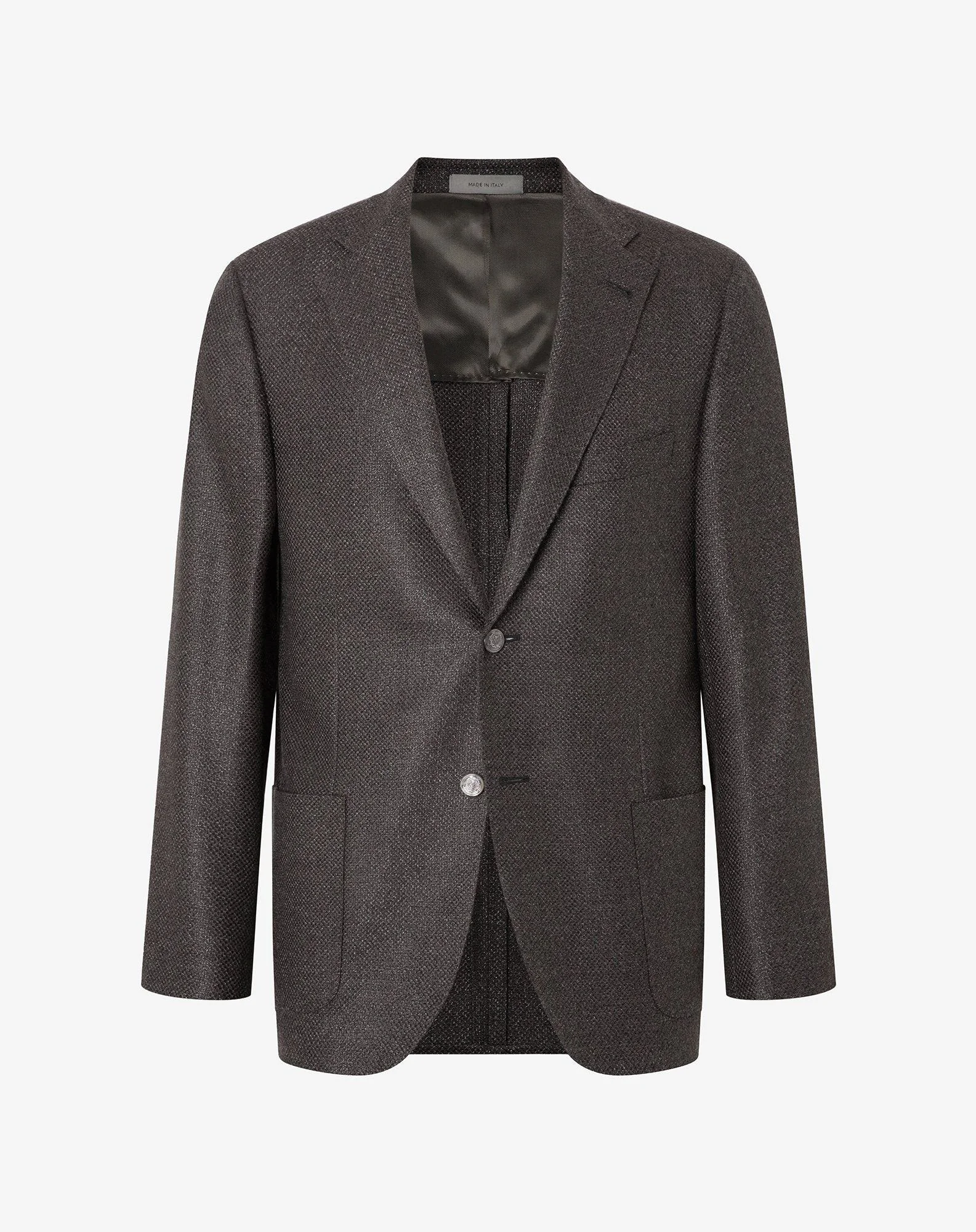 A synthesis of lightness and contemporary sophistication, this single-breasted brown virgin wool, silk and cashmere hopsack jacket expresses the perfect balance between comfort and style. Part of the Academy Light range, it is designed for casual elegance, with an unlined construction and natural shoulders that ensure maximum freedom of movement. The slim fit enhances the figure without constraints, while the 9 cm notch lapels with AMF stitching on the edge and natural horn buttons reveal sartorial accuracy. Side patch pockets, welt breast pocket and double vents on the back complete the design with an urban and versatile spirit. DETAILS AND MATERIALS - 89% virgin wool, 7% silk, 4% cashmere - single-breasted two-button wool, silk and cashmere hopsack jacket - Academy Light range - unlined - drop 7 - slim fit - natural shoulders - notch lapels - lapel width 9 cm - AMF stitching at the edge - welt breast pocket - patch side pockets - double side vent - natural horn buttons - width 74 cm - Made in Italy FIT & WASHING - This garment has a slim fit. The model is wearing a size 50 (IT). Model’s measurements: height 187cm, chest 98cm, waist 82cm, hips 98cm. Dry clean with perchloroethylene, do not bleach, do not tumble dry, maximum iron temperature 110°