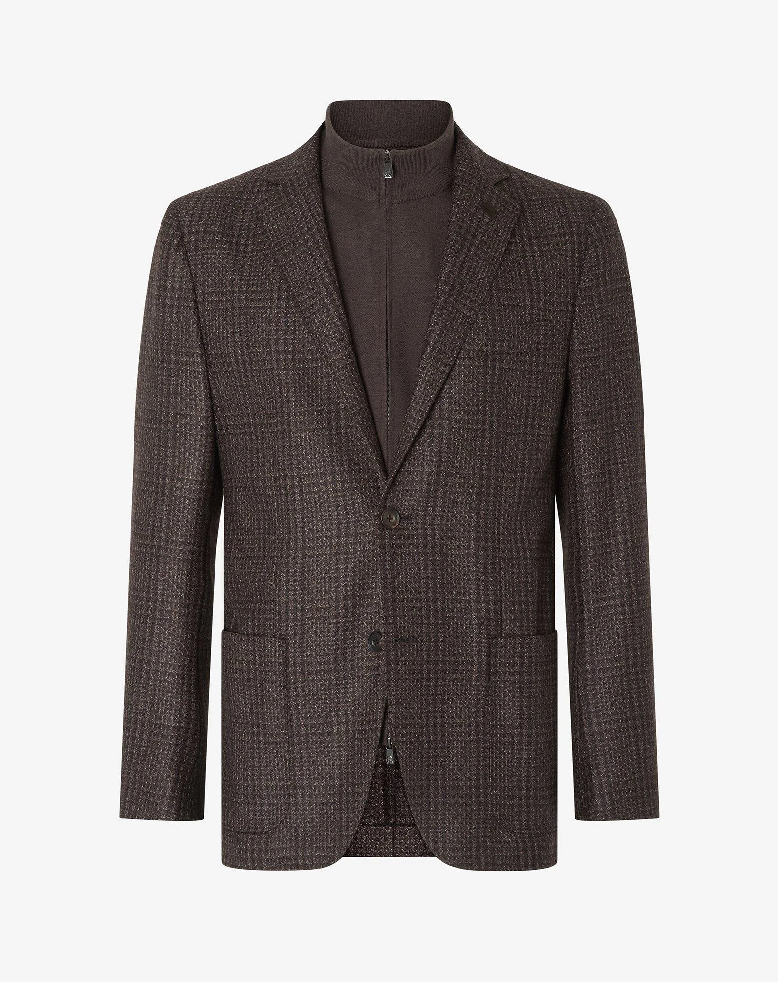 Casual elegance and functionality meet in this brown pure virgin wool twill jacket. The single-breasted, two-button design, with notch lapels and appliqued pockets, recalls the classic aesthetic of the men's wardrobe, while the detachable knitted zipped vest adds a contemporary and versatile touch, perfect for facing the changing season with style. Semi-lined and with a double back vent, it offers a regular fit and natural comfort. A garment designed for the man who seeks a balance between tailoring and modernity. DETAILS AND MATERIALS - 100% virgin wool - single breasted 2-button jacket with detachable zipped knitted vest - semi-lined - drop 7 - regular fit - notch lapels - breast pocket - appliqued side pockets - double rear vent - length 74 cm FIT & WASHING - Dry clean with perchloroethylene, do not bleach, do not tumble dry, maximum iron temperature 110°
