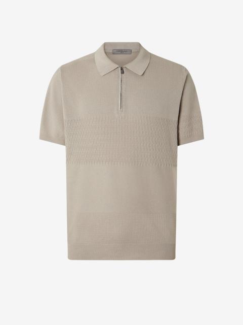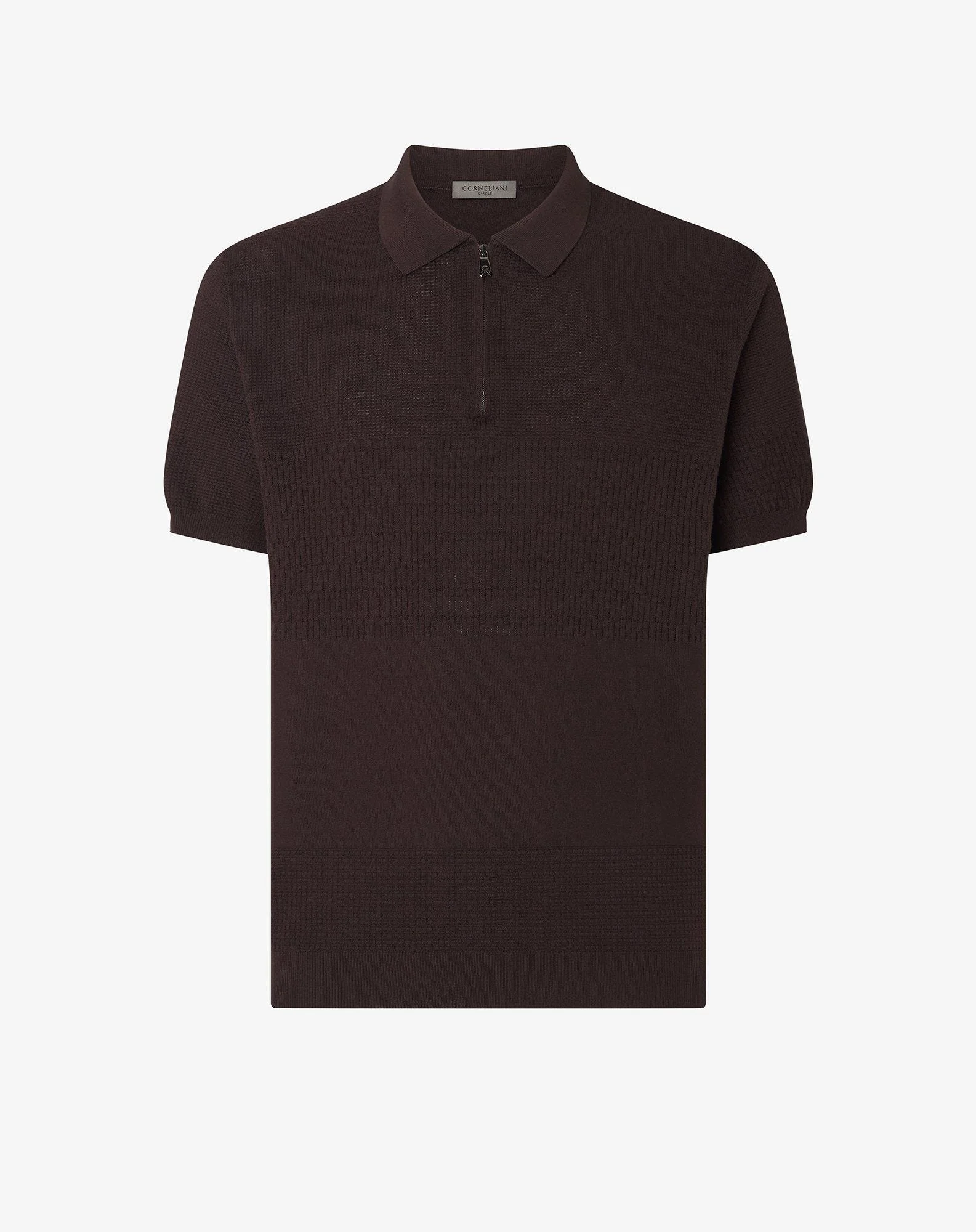 The brown zip-up polo shirt made from fine Pima cotton features a distinctive motif with patch knit stitches. This garment is made in Italy. The enzyme wash makes the garment extra soft. DETAILS & MATERIALS - 100% cotton - short-sleeved zipped polo shirt. Enzyme-treated garment-dyed Pima cotton with different types of knit stitches - 14 gauge - made in Italy FIT & WASHING - The model is wearing a size 50 (IT). Model measurements: height 187cm, chest 98cm, waist 82cm, hips 98cm. Dry clean with perchloroethylene, do not bleach, maximum iron temperature 110A°, do not tumble dry