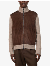 PRODUCT DETAILS - Corneliani suede and wool blend jacket - 100% lamb leather; contrast 98% wool, 2% elastane - Exposed zip fastening at front - Contrast design, stand collar, long sleeves, two zipped pocket at front, metal hardware, knitted trims - Specialist leather clean - Made in Italy - Size UK 40: length 28.3in / 72cm, chest 44.8in / 114cm - Model is 6ft 2in/1.88m and wears a size UK 40 - Lightweight, slight stretch Ref: R04482920