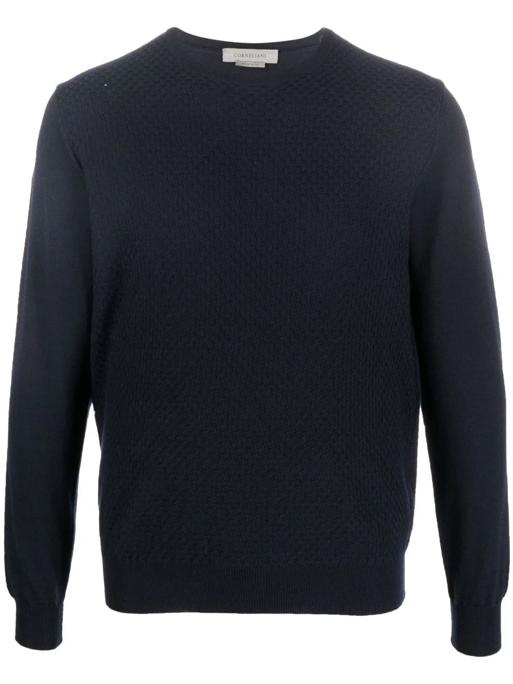 crew-neck long-sleeve jumper navy blue virgin wool fine knit basket weave pattern crew neck long sleeves straight hem Made in Italy Composition Virgin Wool 100% SIZE & FIT Model measurements Height 6 ft 1 in(1.85 m) Bust/Chest 35.82 in(91 cm) Hips 37.79 in(96 cm) Waist 29.13 in(74 cm) Washing instructions Machine Wash
