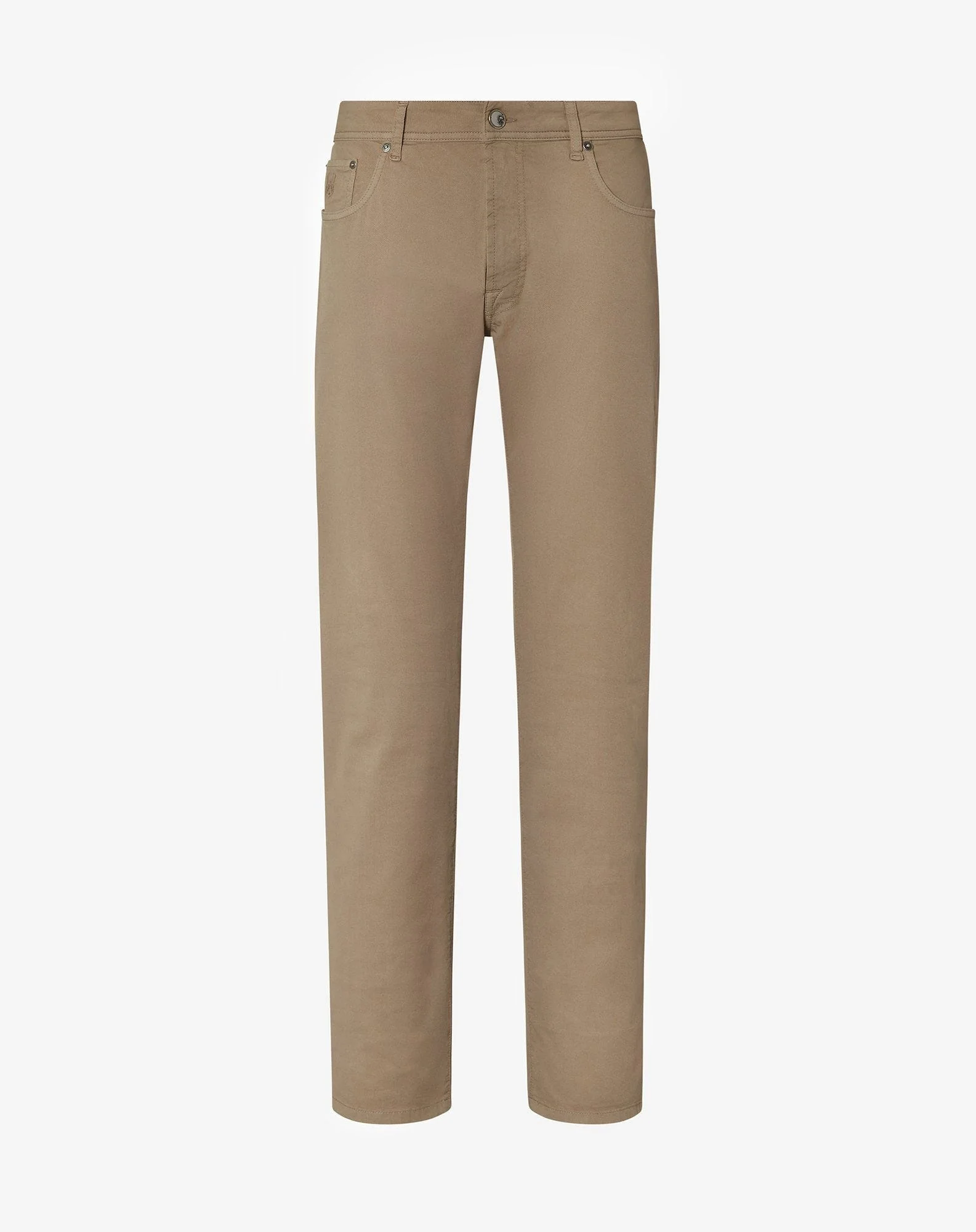 The men's dark beige stretch gabardine five-pocket trousers feature a classic fit and a series of details designed to identify the garment, such as the crest on the coin pocket and leather label on the back. Designed as a versatile garment, the 5-pocket t DETAILS & MATERIALS - 97% cotton, 3% elastane - garment-dyed stretch cotton gabardine 5-pocket trousers - regular fit - Corneliani crest on coin pocket and rear patch - logo buttons and rivets - bottom width 18 cm FIT & WASHING - This garment has a classic fit. The model is wearing a size 34 (IT). Model measurements: height 187cm, chest 98cm, waist 82cm, hips 98cm. Dry clean with perchloroethylene, do not bleach, maximum iron temperature 110A°, do not tumble dry