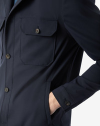 The TECHWOOL project: these garments are crafted from an advanced technical fabric featuring a pleasant structure that is extremely flexible and compact, with excellent anti-crease and rainproof properties. The modern and functional look transfers the typical qualities of sportswear to a sophisticated and dynamic style that caters for different scenarios, from the urban context to the great outdoors. This unlined dark blue overshirt is a case in point, with its practical four pockets that bring a casual style to any look that includes it. DETAILS & MATERIALS - 66% wool, 30% polyamide, 4% elastane - unlined overshirt - front button closure - two appliqued back pockets with buttons - two welt back pockets with zip - back length 70 cm FIT & WASHING - The model is wearing a size 50 (IT). Model measurements: height 187cm, chest 98cm, waist 82cm, hips 98cm. Dry clean with perchloroethylene, do not bleach, maximum iron temperature 110°, do not tumble dry