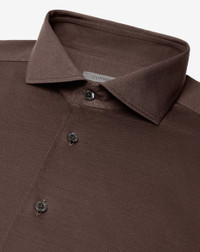 The dark brown pure cotton jersey shirt is a Corneliani wardrobe essential; a versatile garment designed to naturally combine comfort and style. The jersey´s soft and light feel makes the regular fit pleasant throughout the day, while the French collar and rounded cuff ensure a smart look. DETAILS AND MATERIALS - 100% cotton - long-sleeved jersey shirt - regular fit - French collar - rounded cuffs FIT & WASHING - This garment has a regular fit. Maximum wash temperature 40°, do not bleach, dry clean with perchloroethylene with precautions, do not tumble dry, maximum iron temperature 110°