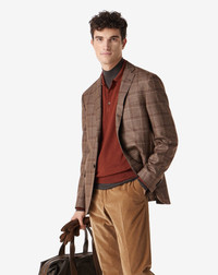 Essential and refined, this brown single-breasted two-button jacket embodies the most authentic sartorial quality. Made of pure 130's virgin wool with an overcheck design, this is pure understated elegance, perfect to accompany the season with a refined but contemporary style. Part of the Academy Light range, the jacket is lined and offers a regular fit, enhanced by details such as the AMF stitching at the edge, the pointed lapels and the real horn buttons. The side flap pockets, the welt breast pocket and the double vent at the back complete a garment designed to guarantee maximum freedom of movement with timeless elegance. DETAILS AND MATERIALS - 100% virgin wool - single-breasted 2-button overcheck 130’s wool jacket - Academy Light range - lined - drop 7 - regular fit - AMF stitching at the edge - notch lapels - welt outbreast pocket - flap side pockets - double rear vent - horn buttons - lapel width 6.6 cm - length 74 cm - Made in Italy FIT & WASHING - Dry clean with perchloroethylene, do not bleach, do not tumble dry, maximum iron temperature 110°