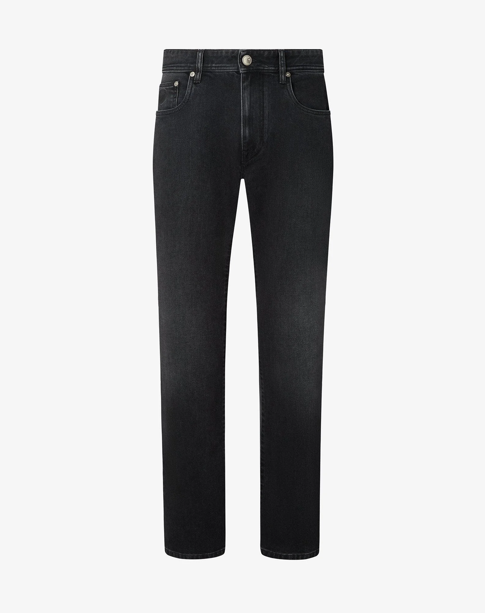 Dark grey 11.5 oz denim jeans, made from a fine cotton and lyocell mix for uncompromising comfort and regular fit. Classic 5-pocket style with drop 7, zip and personalized stud button closure. Fine finishes like the embroidered logo on the coin pocket and the branded rear leather patch. Leg bottom width 20 cm, for a contemporary and versatile fit. DETAILS AND MATERIALS - 79% cotton, 20% lyocell, 1% elastane - 5-pocket denim trousers - drop 7 - 11.5 o.z. - regular fit - personalized stud and zip fly - logo embroidery on coin pocket - logo on back patch - bottom width 20 cm FIT & WASHING - Dry clean with perchloroethylene, do not bleach, do not tumble dry, maximum iron temperature 110°