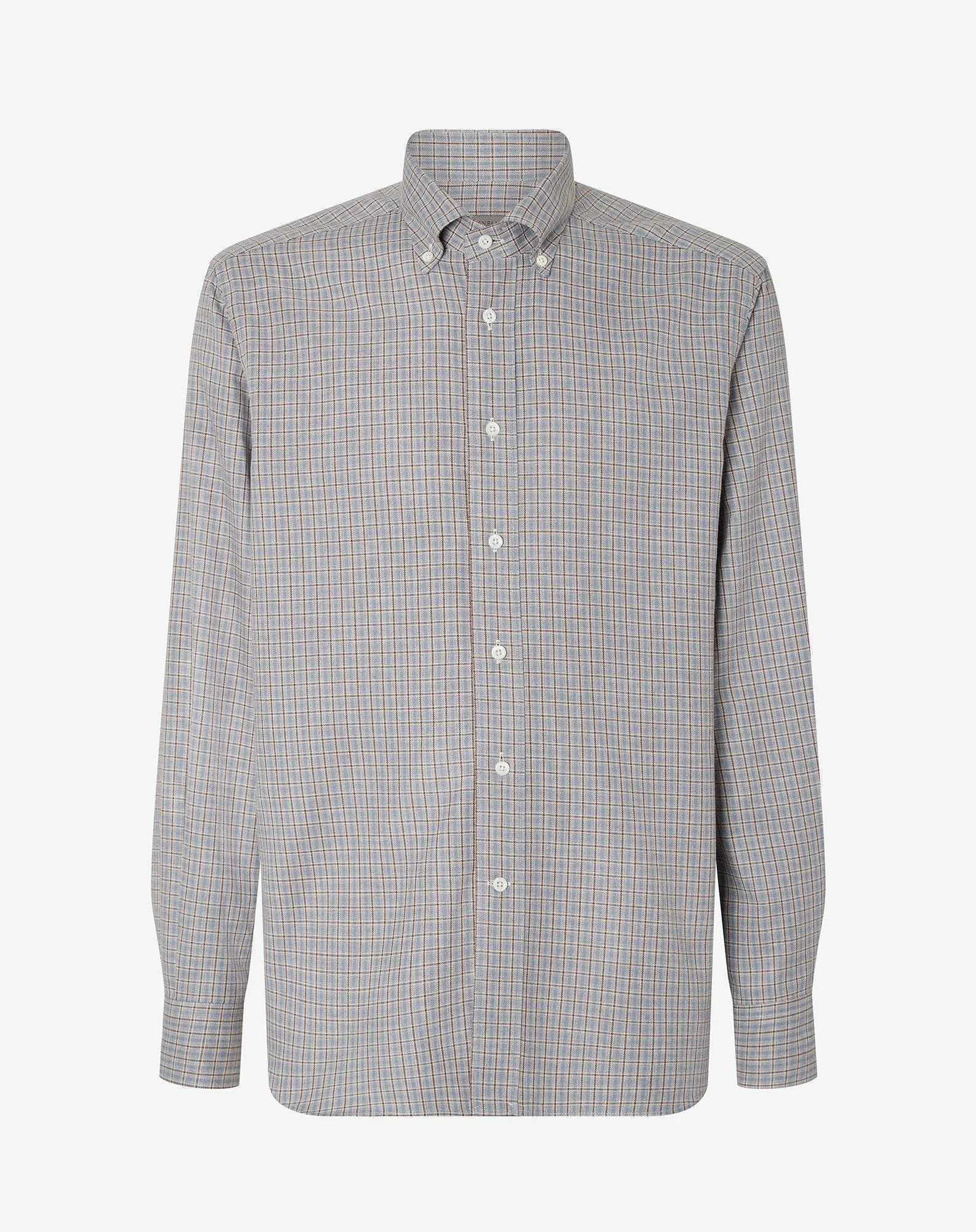A meeting of tradition and character for the cold season. This long-sleeved pure cotton flannel shirt stands out for its blue and brown check pattern, which adds a touch of warm elegance to the men's wardrobe. Its regular fit ensures comfort, while the button-down collar and rounded cuffs complete the design with a touch of understated refinement. A versatile and sophisticated garment, perfect for tackling the most informal moments of the day in style. DETAILS AND MATERIALS - 100% cotton - long-sleeved cotton flannel shirt - regular fit - button down collar - rounded cuffs FIT & WASHING - This garment has a regular fit. The model is wearing a size 41 (IT). Model’s measurements: height 187cm, chest 98cm, waist 82cm, hips 98cm. Maximum wash temperature 40°, do not bleach, dry clean with perchloroethylene, do not tumble dry, maximum iron temperature 150°