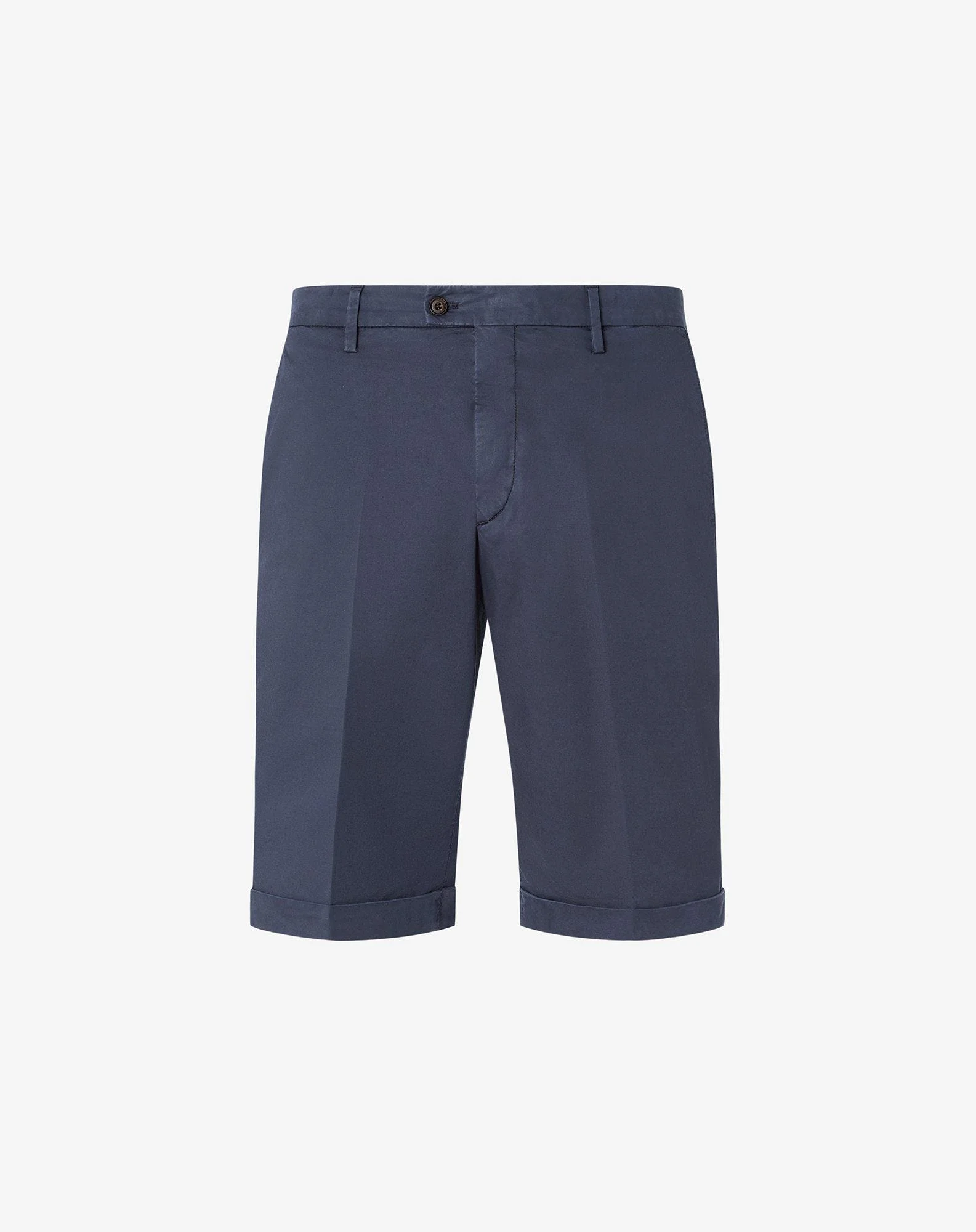 Garment-dyed and clean-cut, these navy blue cotton and stretch lyocell chino Bermuda shorts are designed for a summer of practical comfort. The unlined construction and regular fit ensure natural wearability, while the zip fastening and belt loops maintain a neat fit. Double welt back pockets and an 18 cm hem complete a well-balanced silhouette, ideal for informal but well-groomed looks. DETAILS AND MATERIALS - 73% lyocell, 23% cotton, 4% elastane - stretch lyocell, linen and cotton Bermuda shorts - unlined - regular fit - zip closure - belt loops - double-welted back pockets - bottom width 18 cm