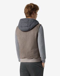The greige 100% leather suede is a sophisticated and functional garment designed for optimal comfort in transitional months. Padded with man-made down, it offers warmth with a minimalist and contemporary style. The detachable hood and metal dual-cursor zip closure provide versatility, while the two zipped welt pockets and the ribbed knit trim at the hem complete the design with practical details: this gilet is made in Italy to provide a sophisticated yet functional look. DETAILS AND MATERIALS - 100% leather - synthetic down padded gilet - detachable hood - drop 7 - metal dual cursor zip closure - two welt back pockets with zip - ribbed knit trim on hem - flannel lining - length 66 cm - Made in Italy FIT & WASHING - Dry clean with perchloroethylene, do not bleach, do not tumble dry, maximum iron temperature 110°