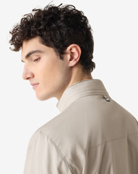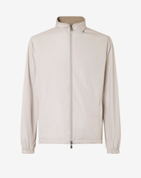This garment has a regular fit. Dry clean with perchloroethylene, do not bleach, do not tumble dry, maximum iron temperature 110° DETAILS AND MATERIALS - Designed for travel and leisure, this grey reversible ultra light technical fabric jacket offers lightweight protection and freedom of movement. The water-resistant fabric, dual cursor front zip fastening, high collar with leather detail and hood combine with elasticated cuffs, external zipped welt pockets and drawstring hem with adjusters to ensure practicality and comfort. With its 67 cm length, it is a dynamic and functional outerwear, ideal for travelling light and the summer season. FIT & WASHING - 100% polyester - reversible jacket - water resistant - front closure with dual cursor zip - standing collar with leather detail - hood - elasticated cuffs - two outside welt pockets with zip - drawstring and adjusters at the hem - width 67 cm
