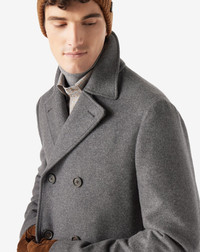 The perfect balance between elegance and functionality, designed to comfortably accompany the coldest seasons. This grey double-breasted six-button peacoat is made of a fine double-sided fabric that combines virgin wool, silk and cashmere, for a soft and warm touch. The unlined construction and regular fit (drop 7) naturally enhance the silhouette, while the notched lapels and the 7 mm sartorial AMF stitching show the attention to the details of haute couture. The slanted hemmed side pockets and real horn buttons add an authentic touch, complemented by the smooth satin lining for a superior feel of comfort. DETAILS AND MATERIALS - 74% virgin wool, 17% silk, 9% cashmere - 6-button double-breasted wool, silk and cashmere double sided peacoat - unlined - regular fit - drop 7 - 7mm AMF stitching at the edge - notch lapels - slanted hemmed side pockets - smooth satin lining - horn buttons - width 78 cm FIT & WASHING - This garment has a regular fit. The model is wearing a size 50 (IT). Model’s measurements: height 187cm, chest 98cm, waist 82cm, hips 98cm. Dry clean with perchloroethylene, do not bleach, do not tumble dry, maximum iron temperature 110°