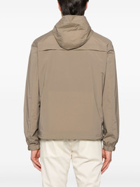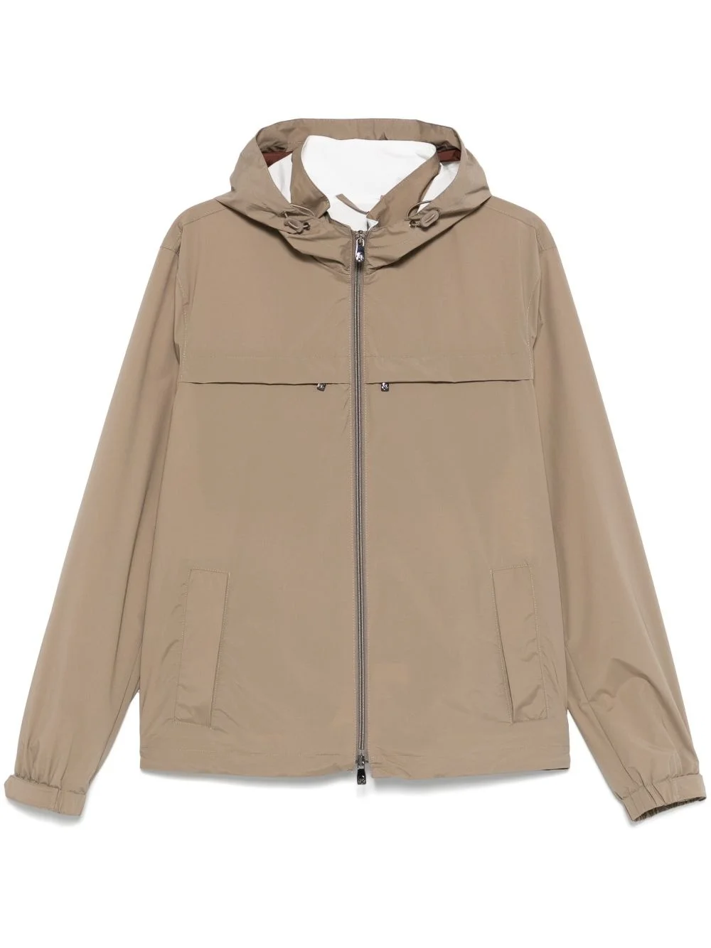 hooded jacket Highlights - Taupe brown - Front two-way zip fastening - Water-resistant - Windproof - Two side welt pockets Imported Composition Outer: Polyamide 87%, Elastane 13% Lining: Polyester 100%, Polyamide 95%, Elastane 5% SIZE & FIT Model measurements Height 6 ft 2 in(1.87 m) Bust/Chest 37.79 in(96 cm) Hips 37.79 in(96 cm) Waist 30.31 in(77 cm) FittingInformation Designed for a relaxed fit, this piece allows for comfort and movement when worn The internal drawstring at the hem allows for fitted preferences Made from a midweight stretch fabric, this piece offers elasticity and flexibility when worn Washing instructions Dry Clean Only
