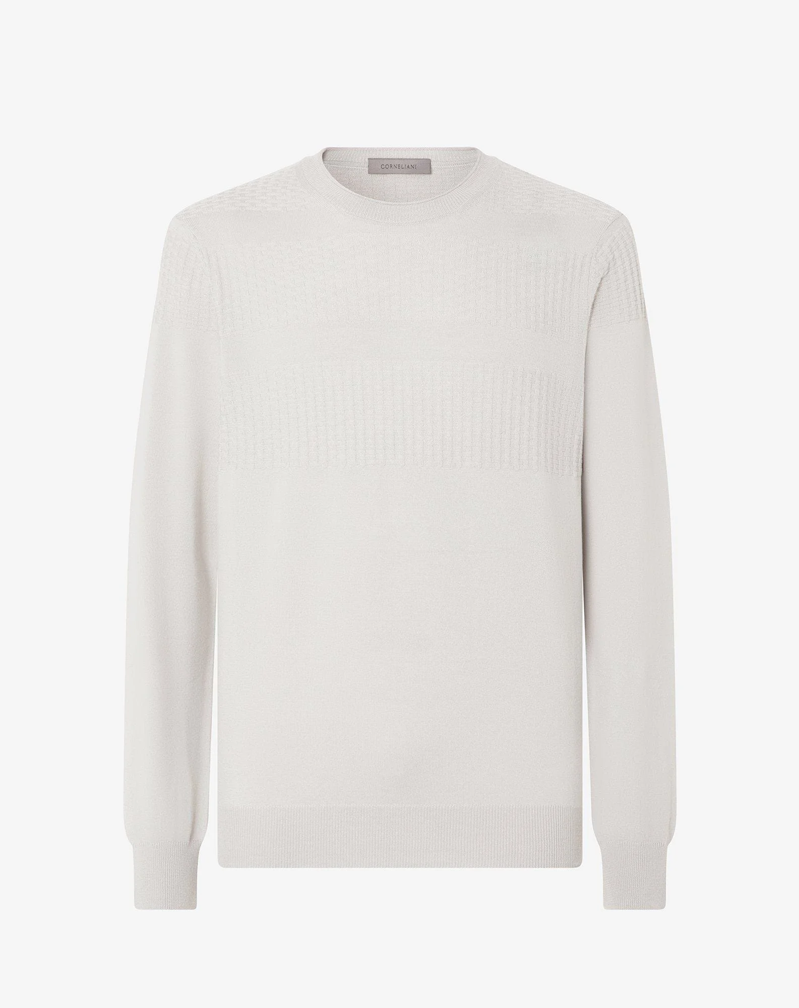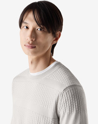 Made from extra fine pure merino wool, this ice white crew neck jumper combines essential style and natural comfort. The combed yarn, worked in 14 gauge with an exclusive striped pattern, gives the garment an understated contemporary elegance. Soft on the skin and naturally thermo-regulating, it is ideal for the coldest season. The certified OEKO-TEX® yarn guarantees the absence of harmful substances and a quality that is in line with the highest international environmental standards. DETAILS AND MATERIALS - 100% virgin wool - long-sleeved crew neck jumper made from extra fine combed merino wool - exclusive placed striped stitch - 14 gauge - Made in Italy FIT & WASHING - Dry clean with perchloroethylene, do not bleach, do not tumble dry, maximum iron temperature 110°