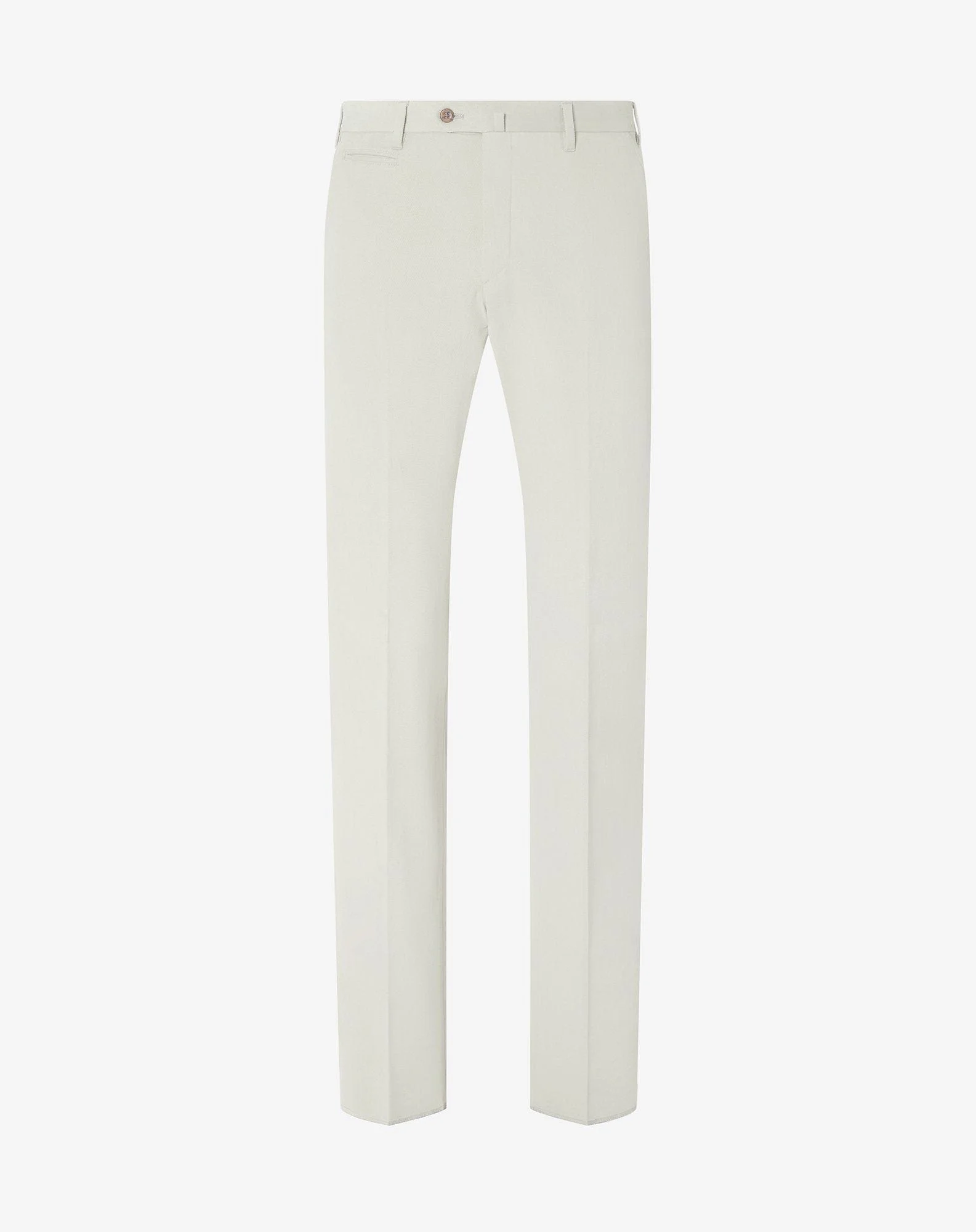 Versatile and functional, these ice white stretch cotton cover trousers blend comfort with style. The stretch and compact fabric enables ease of movement, while the flat front design provides a clean and modern fit. Sartorial details like the waistband closure, belt with V-shaped rear bent and watch pocket confirm the garment's careful craft. Ideal for a casual-smart everyday wear. DETAILS AND MATERIALS - 98% cotton, 2% elastane - stretch cotton cover flat front trousers - drop 7 - regular fit - lined - front zip and waistband closure - belt loops and V-shaped vent on rear - watch pocket - slant side pockets - welted back pockets with zip - bottom width 19 cm FIT & WASHING - Dry clean with perchloroethylene, do not bleach, do not tumble dry, maximum iron temperature 110°