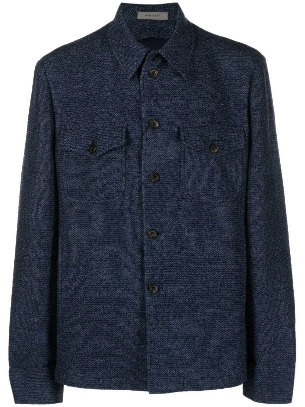 jersey-knit long-sleeve shirt ice blue virgin wool blend jersey knit classic collar long sleeves front button fastening Made in Italy Composition Virgin Wool 70%, Silk 20%, Cashmere 10%