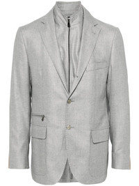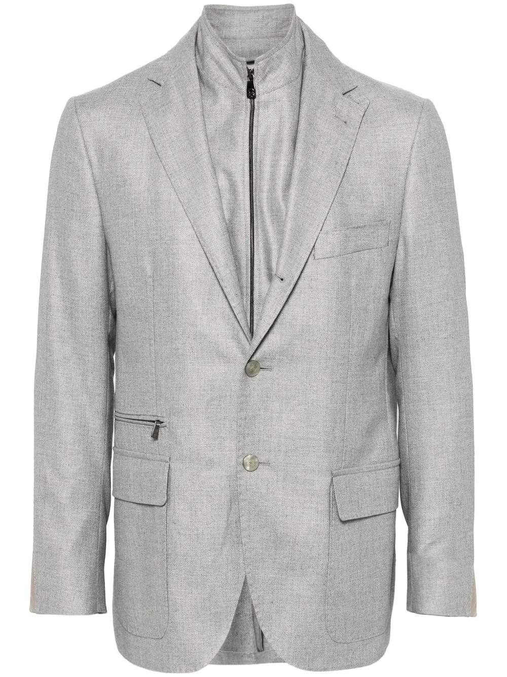 layered melange-effect blazer Highlights - Heather grey - Virgin wool-silk blend - Melange effect - Layered design - Notched collar - Front button and zip fastening - Long sleeves - Elbow patches - Buttoned cuffs - Chest welt pocket - Side zip-fastening pocket - Two side flap pockets - Straight hem Made in Italy Composition Polyester 100% Outer: Silk 55%, Virgin Wool 45% Lining: Viscose 100% SIZE & FIT Model measurements Height 6 ft 2 in(1.87 m) Bust/Chest 34.25 in(87 cm) Hips 36.22 in(92 cm) Waist 29.52 in(75 cm) FittingInformation Designed for a slim fit, offering a comfortable fit that sits just away from the body The detachable internal gilet offers a roomier fit Made from a midweight stretch fabric, this piece offers elasticity and flexibility when worn This piece fits true to size – take your usual size