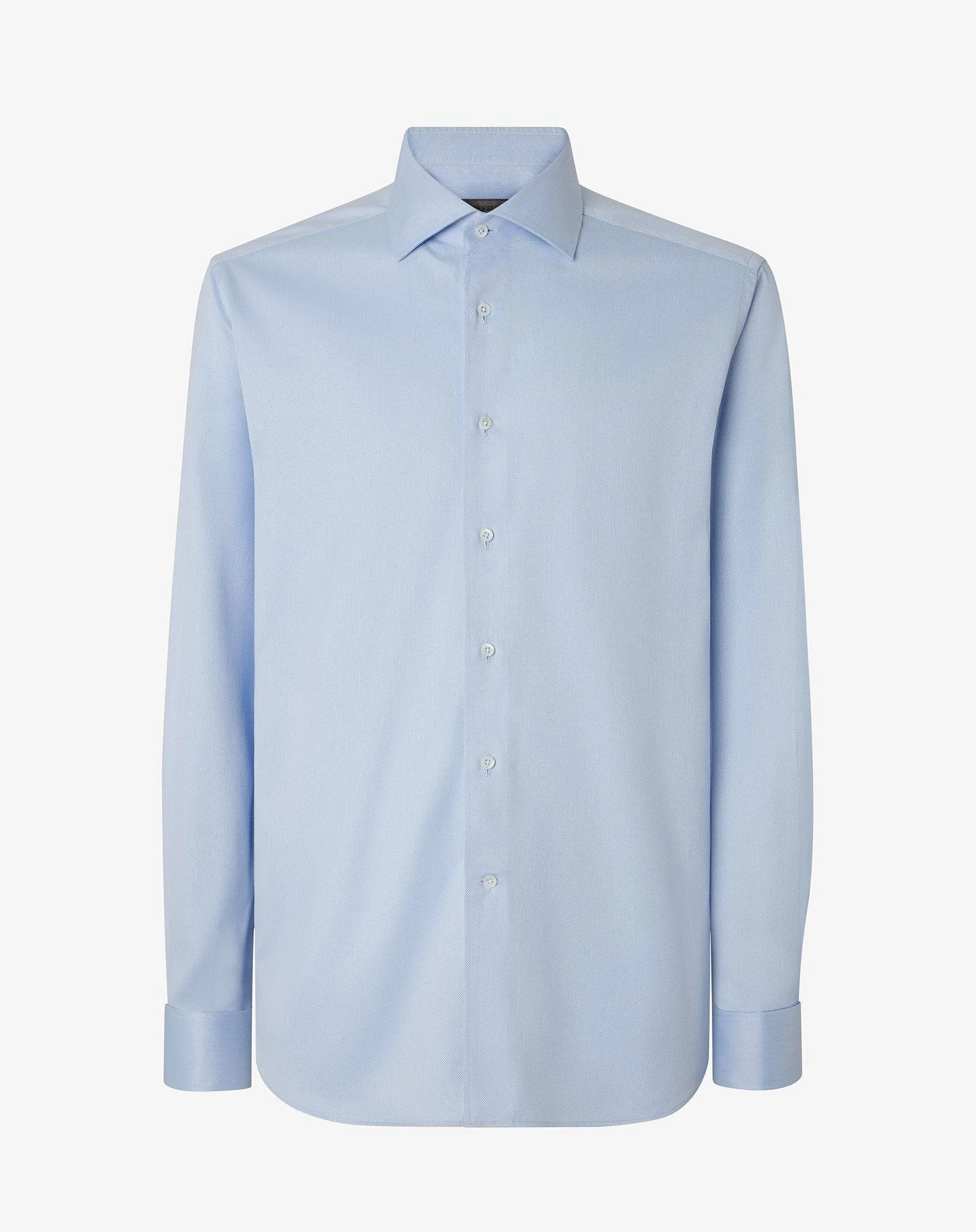 The building block of a gentleman�s wardrobe, this light blue shirt is a minimalist garment that is easy to match. Crafted from honeycomb dobby cotton, it features double cuffs for cufflinks and is therefore ideal for formal occasions. DETAILS & MATERIALS - 100% cotton - long sleeve shirt - regular fit - classic collar - double cuffs for cufflinks - gusset with Corneliani crest FIT & WASHING - This garment has a classic fit. The model is wearing a size 41 (IT). Model measurements: height 187cm, chest 98cm, waist 82cm, hips 98cm. Warm wash up to 40°, do not bleach, maximum iron temperature 150°, dry clean with perchloroethylene, do