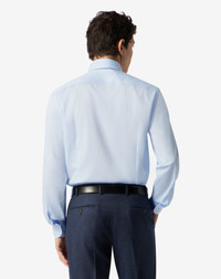 Minimalist elegance, designed to accompany every moment of the day with style and ease. This light blue long-sleeved shirt is made of pure cotton twill, a soft and slightly shiny fabric, which adds depth to the colour and comfort to the touch. The Italian collar and rounded cuffs define a classic and versatile silhouette, while the regular fit ensures a balance between structure and freedom of movement. A timeless garment designed for the man looking for quality, functionality and timeless style. DETAILS AND MATERIALS - 100% cotton - long-sleeved cotton twill shirt - regular fit - straight point collar - rounded cuffs FIT & WASHING - This garment has a regular fit. The model is wearing a size 41 (IT). Model’s measurements: height 187cm, chest 98cm, waist 82cm, hips 98cm. Maximum wash temperature 40°, do not bleach, dry clean with perchloroethylene, do not tumble dry, maximum iron temperature 150°