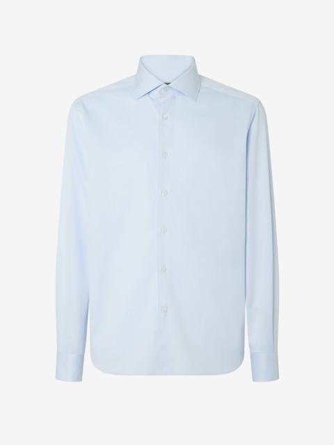 Made of textured cotton with a herringbone pattern, this light blue shirt combines the sobriety of colour with the sophistication of a refined texture. The herringbone pattern gives visual depth and a distinctive touch, maintaining an elegant and versatile design. The regular fit, Italian collar and rounded cuffs complete a minimalist garment designed to adapt with ease to formal or everyday occasions. DETAILS AND MATERIALS - 100% cotton - long sleeve patterned cotton shirt - regular fit - straight point collar - rounded cuffs FIT & WASHING - This garment has a regular fit. The model is wearing a size 41 (IT). Model’s measurements: height 187cm, chest 98cm, waist 82cm, hips 98cm. Maximum wash temperature 40°, do not bleach, dry clean with perchloroethylene, do not tumble dry, maximum iron temperature 150°