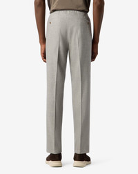 Crafted from a fine melange grey flannel, these trousers blend the understated elegance of Italian tailoring with a contemporary attitude to comfort. The fabric is a fine blend of cashmere and virgin wool that provides softness, warmth and a natural stretch, ideal for easy movement. The flat front and regular fit with drop 6 define a clean, modern fit, while the elastic drawstring waistband adds a relaxed functional touch. These unlined trousers are designed to provide a minimalist style that is also versatile and looks impeccable on every occasion. DETAILS AND MATERIALS - 94% virgin wool, 4% cashmere, 2% elastane - stretch wool and cashmere flannel flat front trousers - drop 6 - regular fit - unlined - zipped flap - elastic drawstring at the waist - slant side pockets - welt back pockets - bottom width 18.5 cm FIT & WASHING - Dry clean with perchloroethylene, do not bleach, do not tumble dry, maximum iron temperature 110°