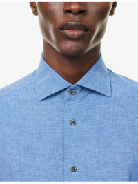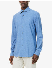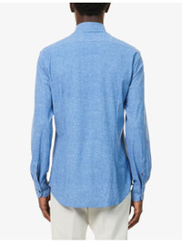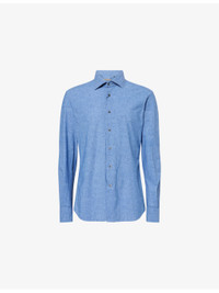 PRODUCT DETAILS - Corneliani chambray shirt - 74% polyamide, 26% elastane - Exposed button fastenings at front - Straight-point collar - Regular fit, collar, long sleeves, buttoned cuffs, branded buttons, logo patch embroidered at hem and interior, curved hem - Machine wash at 30°C - Collar size 15.5: length 30in / 76cm, chest 39in / 99cm - Model is 6ft 2in / 1.88m and wears a collar size 15.5 - Lightweight, non-stretch Ref: R04482896