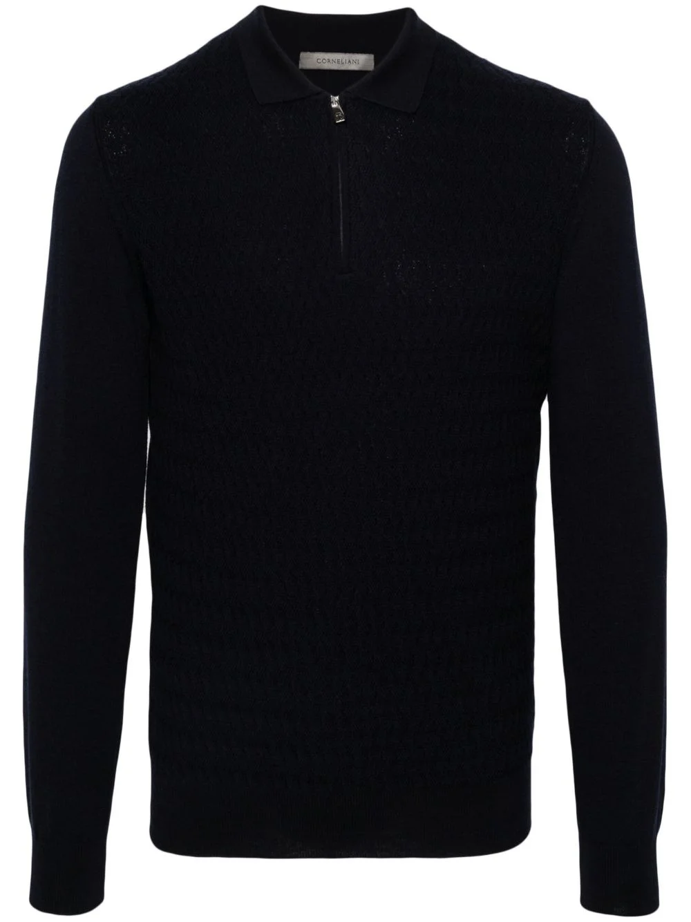 long-sleeved virgin wool polo shirt Highlights - Navy blue - Virgin wool - Knitted construction - Textured finish - Polo collar - Half front zip fastening - Long sleeves - Ribbed cuffs and hem Made in Italy Composition Virgin Wool 100% SIZE & FIT Model measurements Height 6 ft 2 in(1.87 m) Bust/Chest 36.61 in(93 cm) Hips 35.03 in(89 cm) Waist 27.95 in(71 cm) FittingInformation Designed for a slim fit, this polo shirt offers a comfortable fit that sits just away from the body Made with a midweight knit, this piece offers some stretch This piece fits true to size – take your usual size Washing instructions Hand Wash