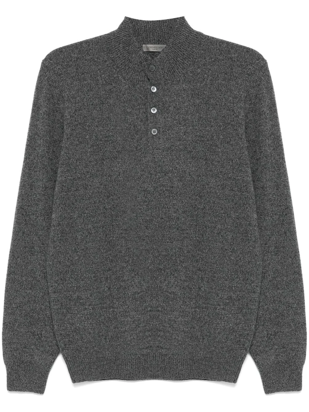 melange sweater Highlights - Anthracite grey - Cashmere-wool blend - Knitted construction - Melange effect - Front button placket - Mock neck - Long sleeves - Ribbed cuffs and hem Made In Italy Composition Cashmere 97%, Wool 3% SIZE & FIT Model measurements Height 6 ft 0 in(1.84 m) Bust/Chest 35.82 in(91 cm) Hips 37 in(94 cm) Waist 28.34 in(72 cm) FittingInformation Designed for a relaxed fit, this piece allows for comfort and movement when worn The ribbed hem offers a close, comfortable fit Made with a midweight knit, this piece offers some stretch