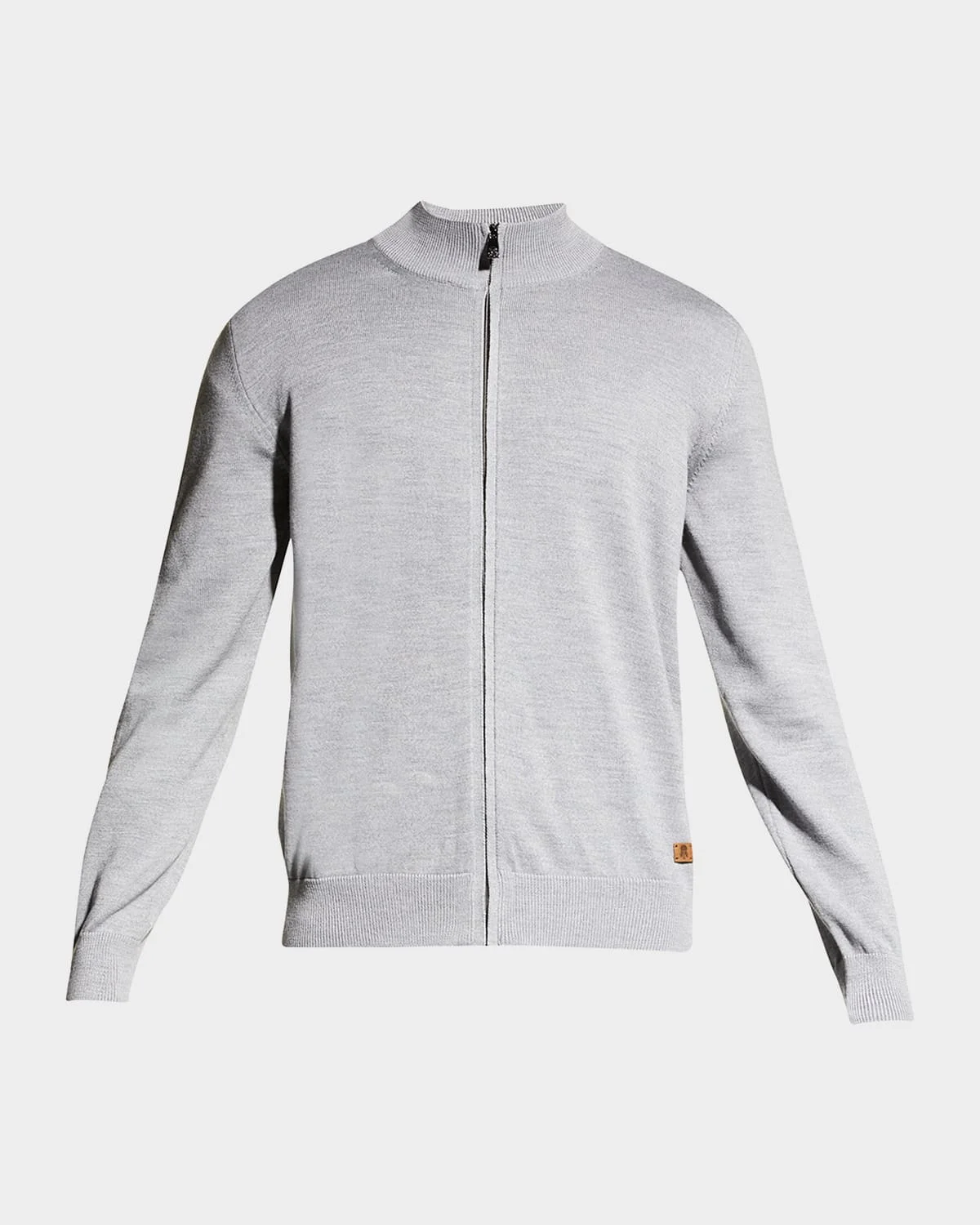 - Corneliani solid track jacket - Mock neckline; zip front - Long sleeves - Ribbed trim - Logo patch at front hem - Wool/polyester - Made in Romania - Model is 6'1"/185cm.