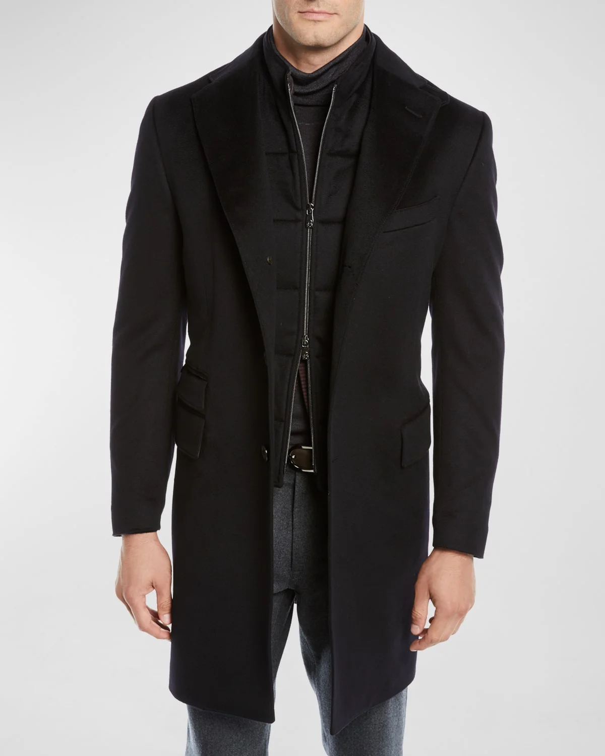 - Corneliani top coat in wool. - Approx. 41.5"L down back. - Notched collar; button front. - Button cuffs. - Chest welt pocket. - Flap zip pockets. - Tailored fit. - Polyester/nylon lining. - Dry clean. - Made in Italy. - Proposition 65 warning for California residents - Model is 6'1"/185cm. - This product contains perfluoroalkyl and polyfluoroalkyl substances (PFAS). For more information, please visit the manufacturer’s website.