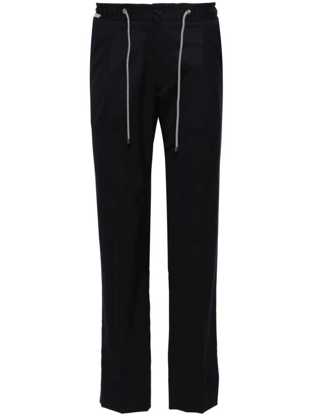 mid-rise tailored trousers Highlights - Navy blue - Interlock twill weave - Pleat detailing - Pressed crease - Mid-rise - Concealed fly and button fastening - Elasticated drawstring waistband - Two side slit pockets - Two rear welt pockets - Tailored cut - Tapered leg Imported Composition Outer: Polyester 65%, Cotton 35% Lining: Polyester 65%, Cotton 35% SIZE & FIT Model measurements Height 6 ft 2 in(1.87 m) Bust/Chest 36.22 in(92 cm) Hips 37 in(94 cm) Waist 27.95 in(71 cm) FittingInformation Designed for a slim tapered leg, offering a close fit that sits just away from the leg with a closer fit towards the ankle Adjust this piece’s waistband to your preference using the drawstring Made from a midweight non-stretch fabric This piece fits true to size – take your usual size