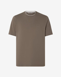 This mud-brown short-sleeved crew neck t-shirt is made from pure compact cotton jersey, a fabric whose durable, compact structure ensures an impeccable fit. The two-tone double collar adds an understated graphic detail, perfect for an essential yet refined style. DETAILS AND MATERIALS - 100% cotton - short sleeve crew neck t-shirt made from pure compact cotton jersey - two-tone double collar FIT & WASHING - Dry clean with perchloroethylene, do not bleach, do not tumble dry, maximum iron temperature 110°