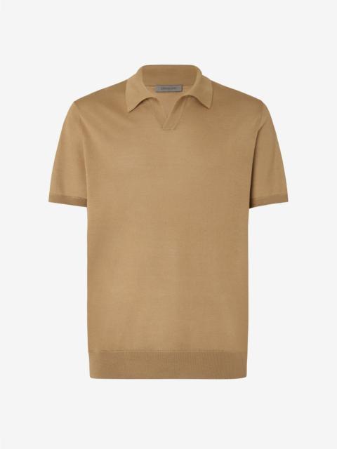 The navy blue buttonless pure silk polo shirt concentrates softness and lightness in a fine 18 gauge knit, ideal for the warm season. The short-sleeved construction with a clean neckline draws a minimalist design that enhances the floaty fabric, perfect for adding a sophisticated touch to informal looks or wearing under unstructured blazers. DETAILS AND MATERIALS - 100% silk - short-sleeved buttonless polo shirt made from pure luxury schappe silk - 18 gauge - Made in Italy FIT & WASHING - This garment has a regular fit. Dry clean with perchloroethylene, do not bleach, do not tumble dry, maximum iron temperature 110°