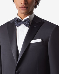 Our S130 wool twill tuxedo features a classic fit. The S130 quality of our wool guarantees an extra-fine yarn that has been spun several times, making the fabric lighter, stronger and softer to the touch, suitable for all seasons.||In the two-button single breasted jacket, the elegant pointy lapels feature a satin finish: a precious detail that also enhances the welt pockets and fully covered buttons. The pleat-less trousers feature a clean fit that perfectly suits the leg. Ideal complement to the Men’s formal suit is a classic collar shirt or a tuxedo shirt, and the unmissable satin bow tie. DETAILS AND MATERIALS - Lined three-piece tuxedo with single breasted two-button jacket made from 100% S130 wool twill - Made in Italy - Drop 7 - Satin pointy lapels - Lapel width 7.6 cm - Satin welt pocket on the sides - Jacket length at rear 74 cm - Double rear slit - Satin covered buttons - 4-button waistcoat - No-pleat trousers - Slanted pockets - Trouser bottom width 19 cm FIT & WASHING - Fit The suit has a classic fit. The model is wearing a size 50 (IT). Model measurements: height 187cm, chest 91 cm, waist 72cm, hips 92 cm. - Washing Gentle dry clean. Do not bleach. Do not tumble dry. The garment can be steam or dry ironed at a low temperature (110 °C).
