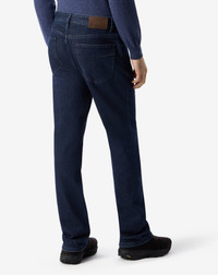 The men's stretch cotton and cashmere 5-pocket trousers feature straight leg, regular fit and carefully designed details that personalize the garment, such as the Corneliani crest on the coin pocket and the real leather label on the back. Designed as a versatile garment, denim trousers naturally adapt to formal or casual outfits depending on how they are matched. DETAILS AND MATERIALS - 93% cotton, 6% cashmere, 1% elastane - stretch cotton and cashmere 5-pockets jeans-like trousers - 10 oz washed denim - straight fit - Corneliani crest embroidery on coin pocket - galvanized metal logo rivets - gun metal colour zip fly - leather logo back patch - 20 cm bottom width FIT & WASHING - The model is wearing a size 50 (IT). Model measurements: height 188cm, chest 98cm, waist 81cm, hips 97cm. Dry clean with perchloroethylene, do not bleach, maximum iron temperature 110°, do not tumble dry