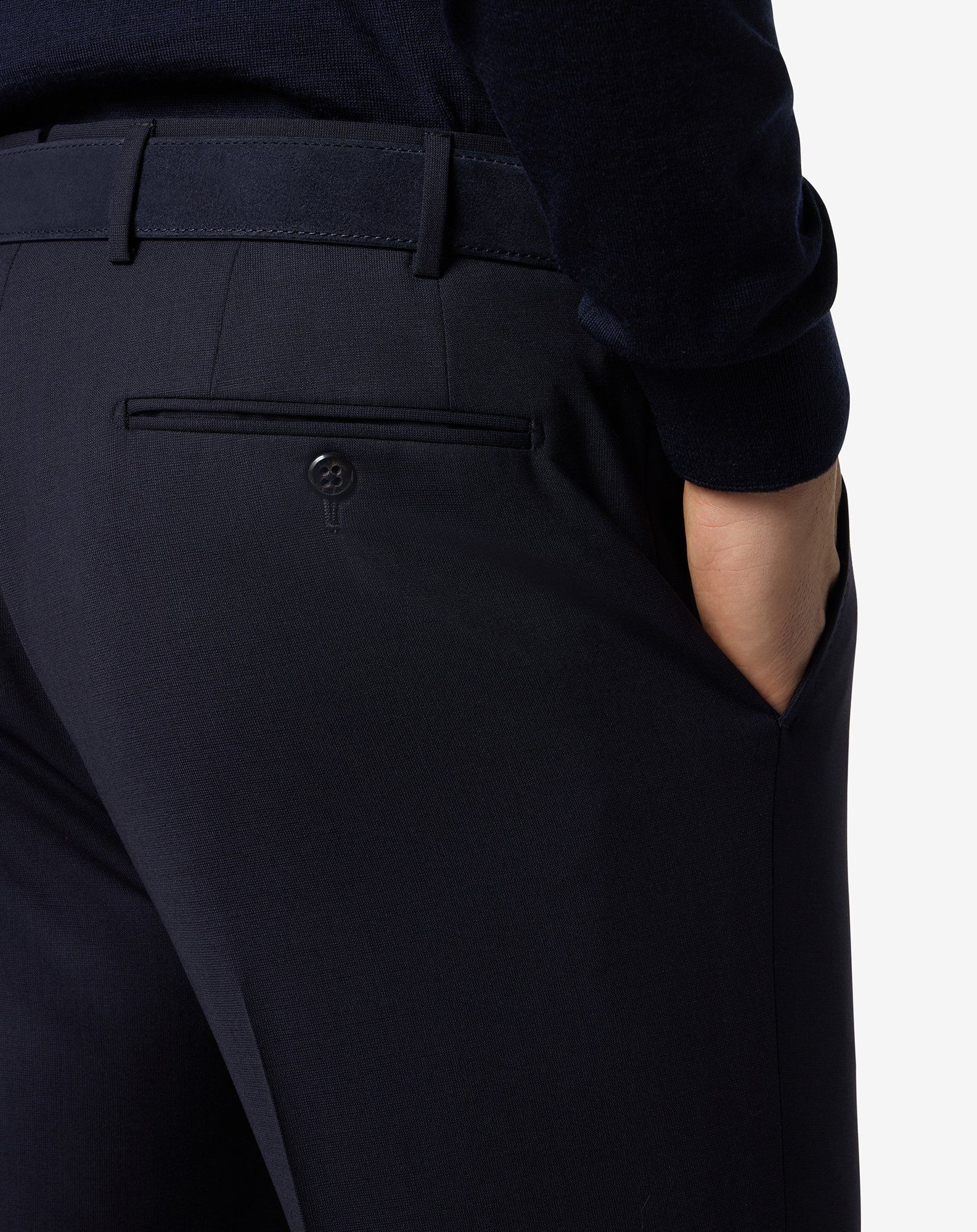 Crafted from a fine virgin wool bengaline with a slightly stretch component, these blue trousers stand out for their minimalist design and regular fit. Their flat front design with front waistband and zip fastening enhances the silhouette while keeping a natural comfort. Sartorial details like the belt with V-shaped rear vent, slanted side pockets and double-welted back pockets with buttons complete this versatile garment, perfect for everyday elegance. DETAILS & MATERIALS - 98% virgin wool, 2% elastane - stretch wool bengaline flat front trousers - drop 7 - regular fit - lined - front zip and waistband closure - belt loops and V-shaped vent on rear - slant side pockets - double-welt and button back pockets - bottom width 19 cm FIT & WASHING - Dry clean with perchloroethylene, do not bleach, do not tumble dry, maximum iron temperature 110°