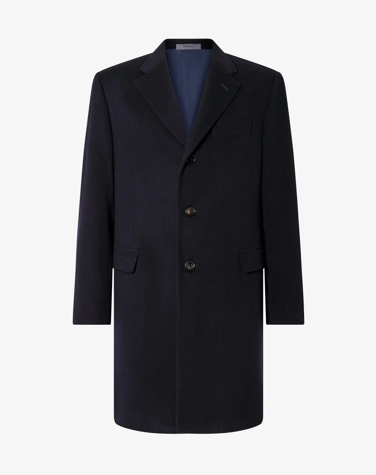 The highest quality superfine wool enhances the classic lines of this single-breasted men’s coat, the unrivalled star of the winter season. In navy blue, the garment features special details like horn buttons. DETAILS AND MATERIALS - 100% virgin wool - 3-button single-breasted superfine wool beaver coat - lined - regular fit - natural shoulders without pads - AMF edge stitching - notch lapels - welt outbreast pocket - flap pockets on the side - horn buttons - centre-vented back - 95 cm back length - made in Italy FIT & WASHING - The model is wearing a size 50 (IT). Model measurements: height 188cm, chest 98cm, waist 81cm, hips 97cm. Dry clean with perchloroethylene, do not bleach, maximum iron temperature 110°, do not tumble dry