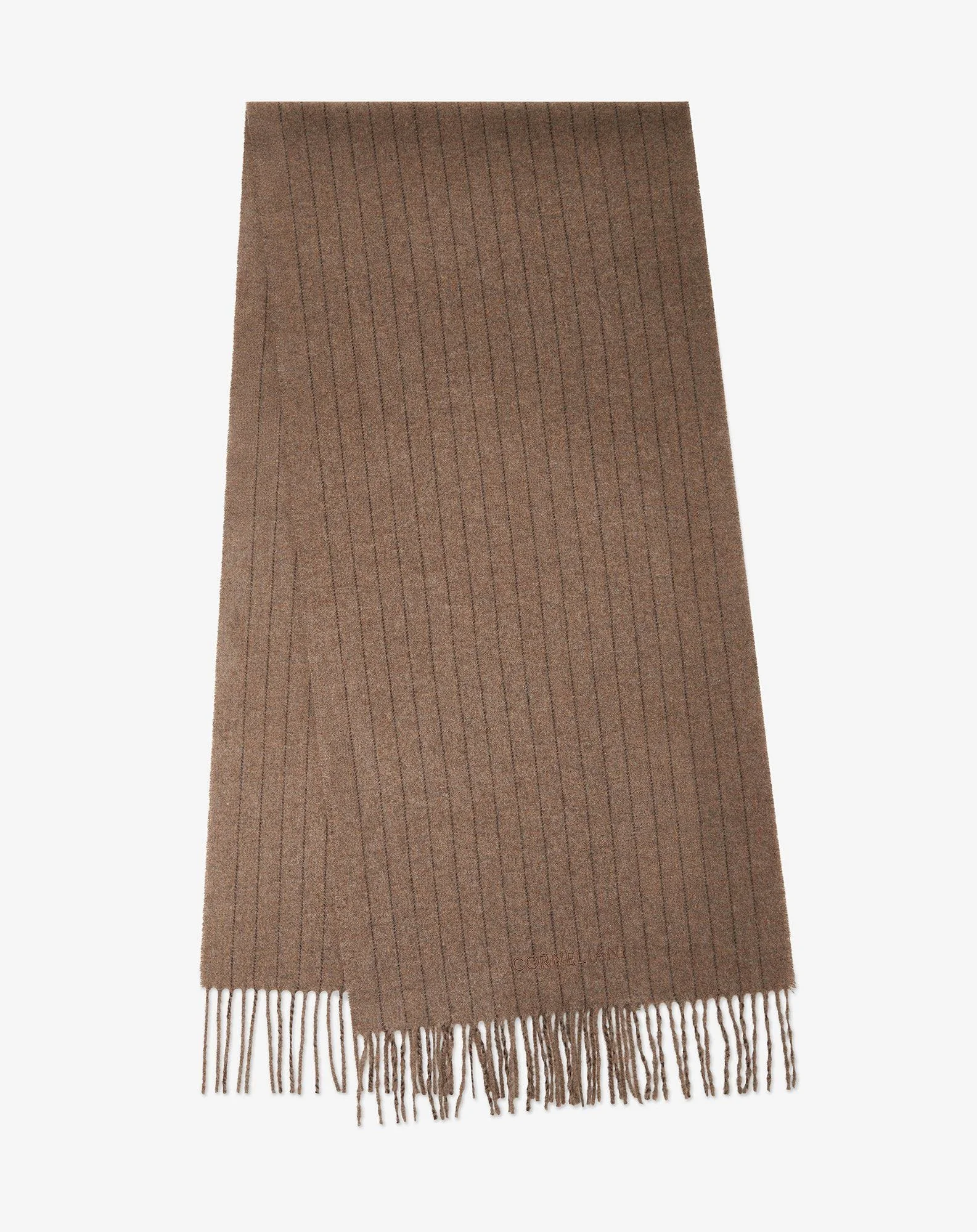 This jacquard scarf made from virgin wool and cashmere reinterprets the classic pinstripe pattern with modern minimalism. The brown hues, soft feel and lightweight fringes enhance its minimalist elegance, completed by the embroidered logo DETAILS AND MATERIALS - 90% virgin wool, 10% cashmere - fringed jacquard scarf - embroidered logo - size: 37x180 cm - Made in Italy FIT & WASHING - Dry clean with perchloroethylene, do not bleach, do not tumble dry, maximum iron temperature 110°
