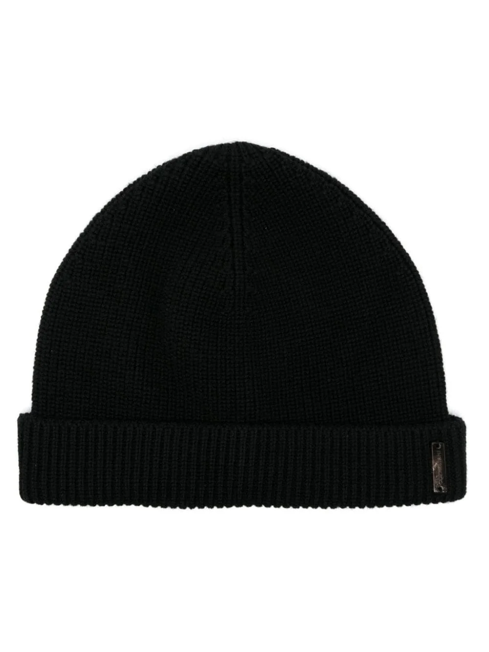 ribbed virgin wool beanie Highlights - Black - Virgin wool - Ribbed knit - Tonal logo plaque - Curved peak - Turn-up brim Made in Italy Composition Virgin Wool 100% Washing instructions Hand Wash